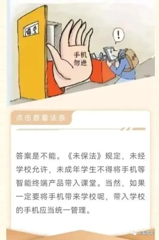 学生吸烟危害大学校周边卖香烟不可取案例小张和强子都是初中学生,两个人是好哥们,小张是老师眼里的好学生,但强子学习不太好,而且经常旷课,有一天强子把小张拉到学校小树林神秘地说:“我有好东西,要不要试试?”小张问:“你这香烟是从哪里来的?”强子边吞云吐雾边得意地说:“咱学校对面的小卖部呗。来,是不是爷们,我爸说了,男子汉就是要抽烟喝酒。”说着把点着的烟放进了小张的嘴里。后来相关部门查处了向强子售卖香烟的商店。《未成年人保护法》第五十九条规定:学校、幼儿园周边不得设置烟、酒、彩票销售网点。禁止向未成年人销售烟、酒、彩票或者兑付彩票奖金。烟、酒和彩票经营者应当在显著位置设置不向未成年人销售烟、酒或者彩票的标志;对难以判明是否是未成年人的,应当要求其出示身份证件。任何人不得在学校、幼儿园和其他未成年人集中活动的公共场所吸烟、饮酒。普法问答时间:未成年人是否可以自己入住酒店呢?可以入住,但根据《未成年人保护法》,单独入住须询问法定监护人联系方式进行确认;与其他成年人入住,须询问入住人员身份关系等,发现有违法犯罪行为应报告公安机关并通知监护人。成年人是否能够进入网吧、酒吧、KTV等娱乐场所?不能,根据《未成年人保护法》,这些娱乐场所不得允许未成年人进入,酒吧、KTV等鱼龙混杂、经常发生打架斗殴事件、也是毒品等集散地,不适合未成年人进入。网络保护篇这部分可是《未成年人保护法》新加的buff,虚拟世界很精彩,网络已经成为同学们学习、生活不可缺少的一部分,那么,针对网络方面,未成年人保护法又作出了哪些规定呢?01 手机到底能不能带进课堂?