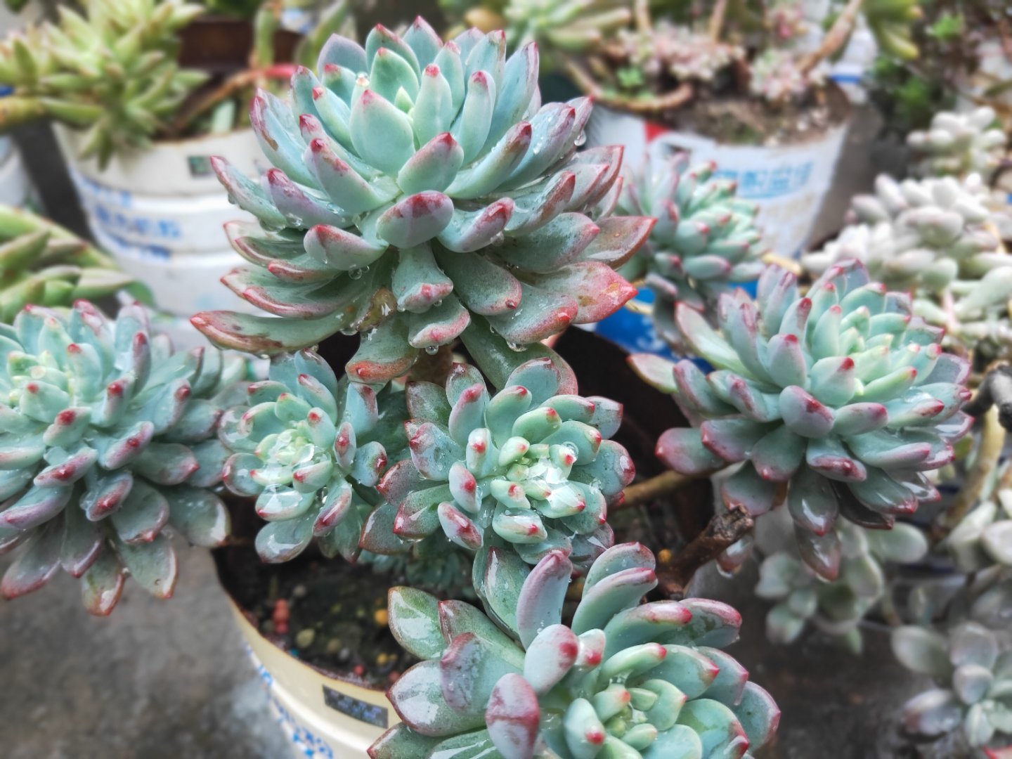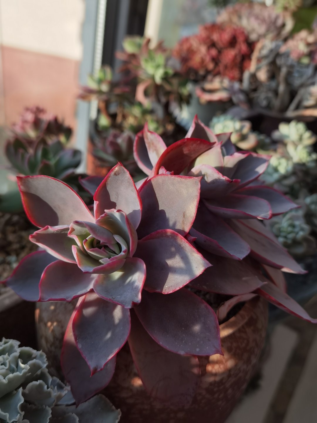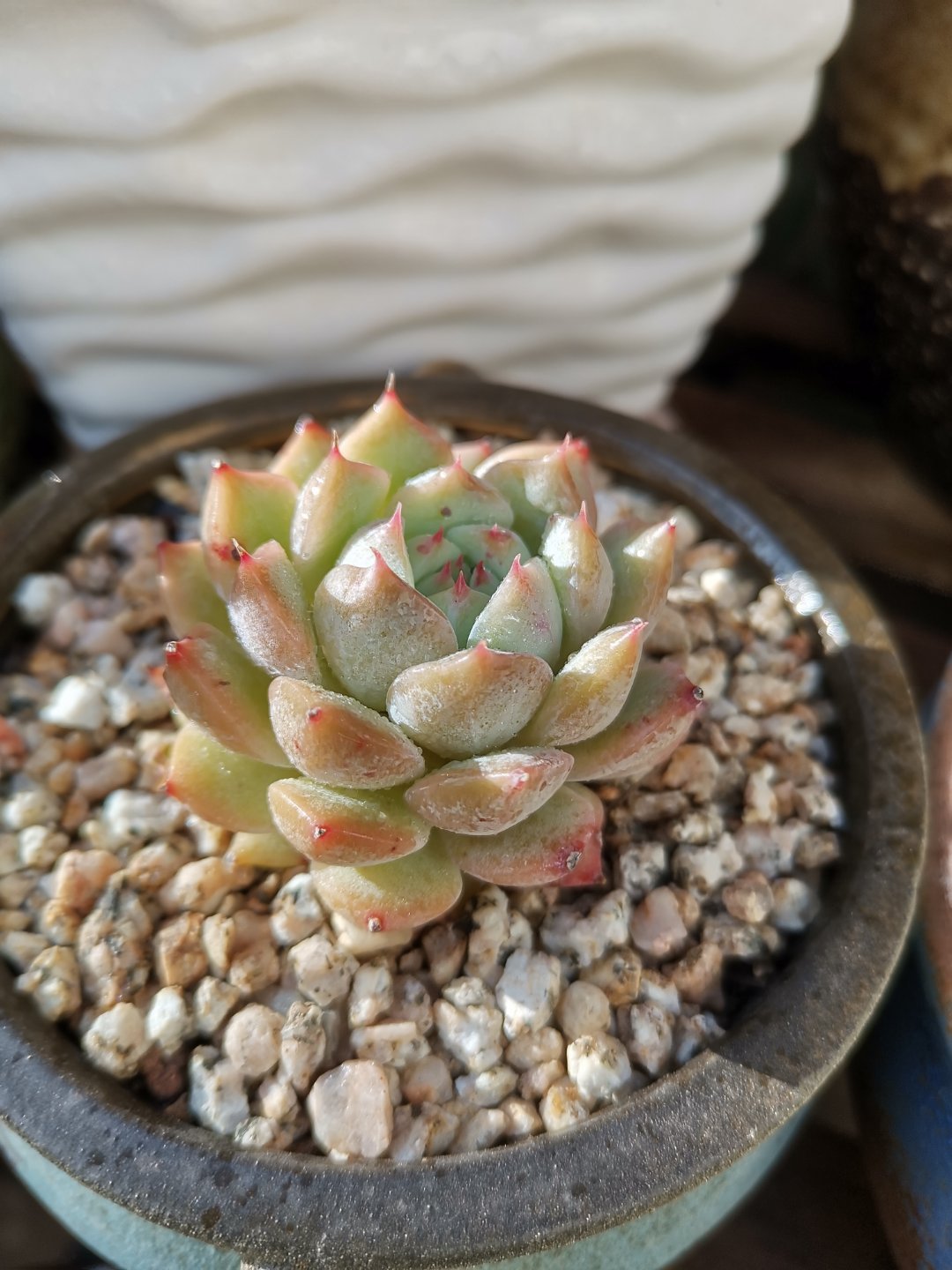 普货静夜!小家碧玉精致乖巧,它的叶尖有一点小小的红色特别惹人怜爱,据说是度夏困难户。身处包邮区,经历三年时间从小单头到爆盆,一直没有换盆是入坑肉之一。