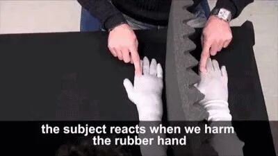 就像著名的橡胶手错觉实验:主试者将一只橡胶手置于被试者面前的桌面上,用挡板将被试者的真手遮挡于其视线之外,之后用两把规格相同的刷子同时轻刷橡胶手和被试者的真手。约10分钟后,大多数被试者报告感觉橡胶手仿佛成为了自己身体的一部分,客观的本体感觉偏移结果也显示被试者会更偏向于认为真手是位于橡胶手所在的位置。