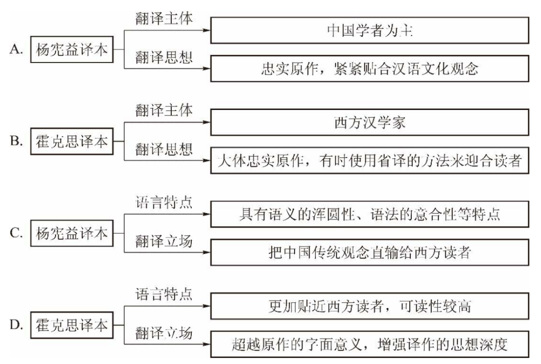 3.下列对材料相关内容的分析和评价,正确的一项是A.材料一分析了杨译本的长处和不足,指出应当客观、公正地看待中国典籍翻译实践和接受之间的窘况与差距。B.材料二使用“临摹”的概念,意在强调杨译本对于《红楼梦》的绝对忠实,这与霍译本的间或背信弃“意”形成了对比。C.材料三认为只有完成两种异质文化观念转换生成的翻译者,才有可能创造性、补充性与生成性地重构《石头记》。