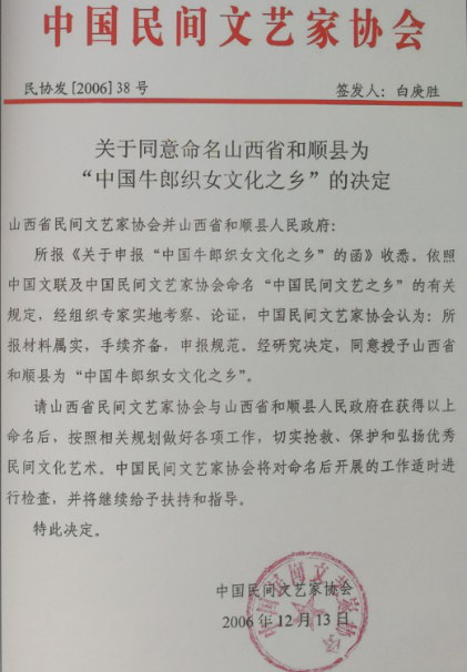 [2] 白庚胜,“中国牛郎织女文化之乡”命名于保护工作[N],中国民间文学家协会,民协发[2006]38号,2006年12月13日.
