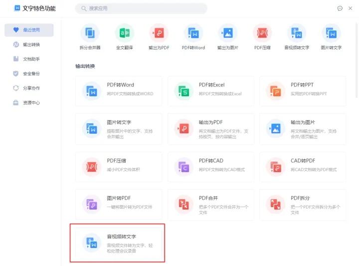 打开wps,在输出转换功能中选择【音视频转文字】功能,点击【视频转文字】并上传视频。
