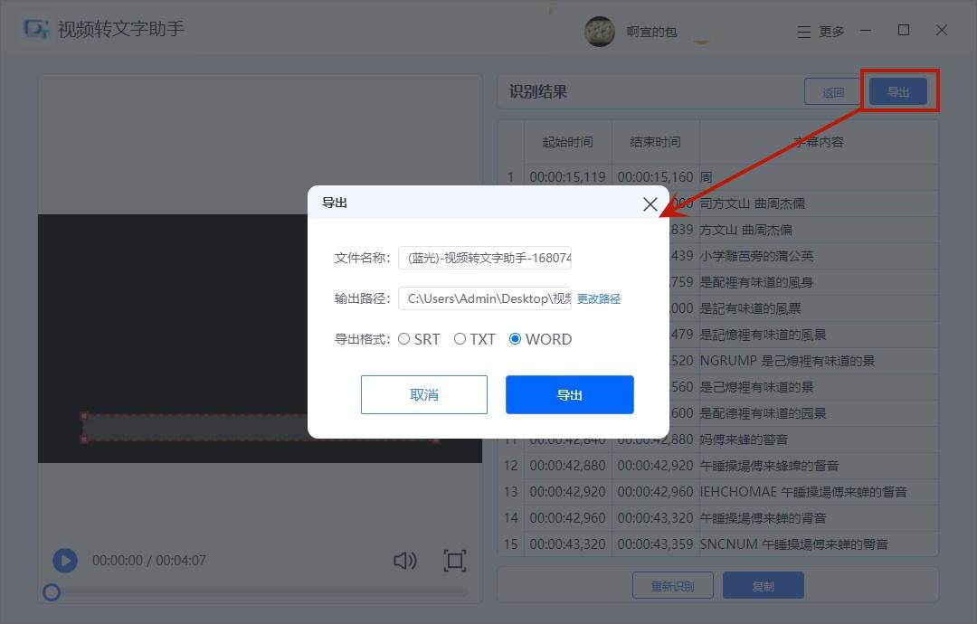 点击【视频字幕提取】功能,添加视频,就可以直接提取其中的字幕。提取完成后,可以直接复制文字,也可以点击右上角的【导出】把字幕保存为srt、txt、word格式。