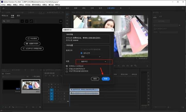 打来PR,导入需要转换的视频文件,在上方的功能栏中找到【字幕和图形】功能,然后点击【转录系列】按钮,在弹出来的窗口中设置转换的语言,并点击【转录】按钮。