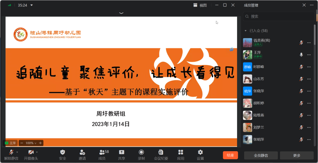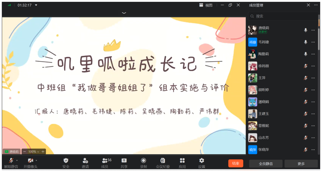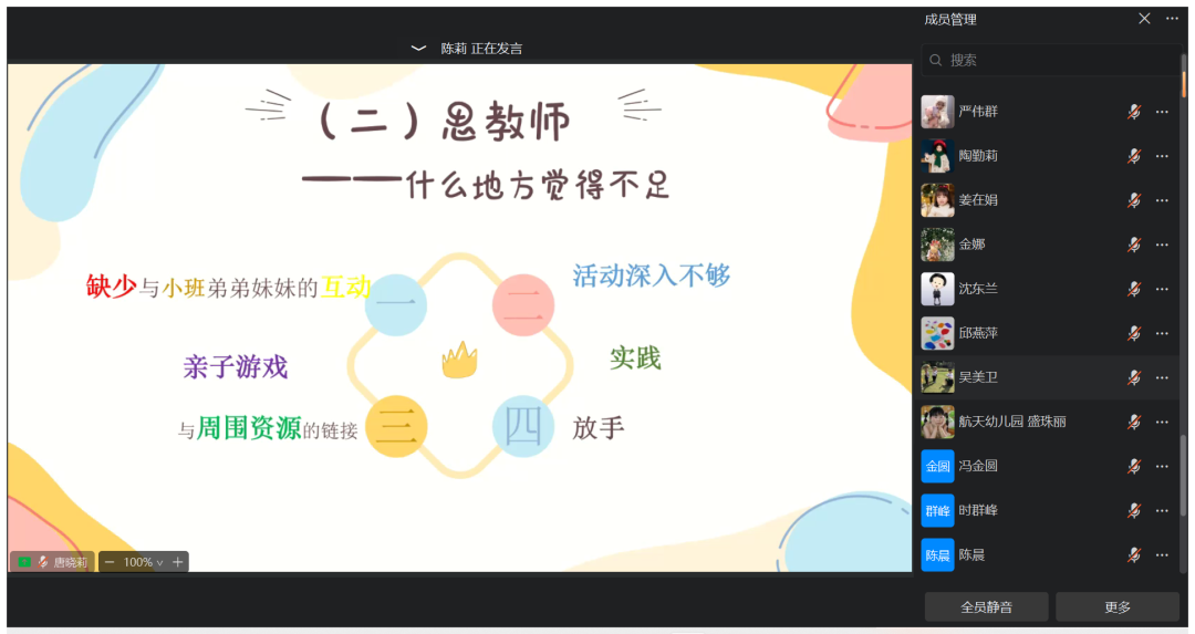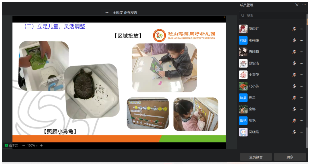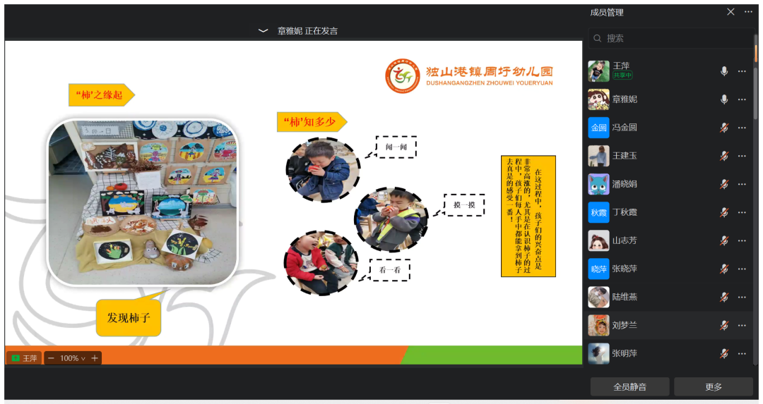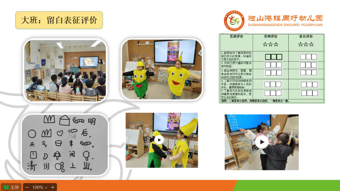 周圩教研组一组团队分享的是小、中、大三个年龄阶段在“秋天”主题中关于“课程评价”方面的实践,教研组老师们结合前审议、中审议、后审议以及在日常生活、集体教学活动等不同的评价方式关注到了不同年龄阶段孩子的特点,基于他们的特性进行适宜的多元化课程的评价。