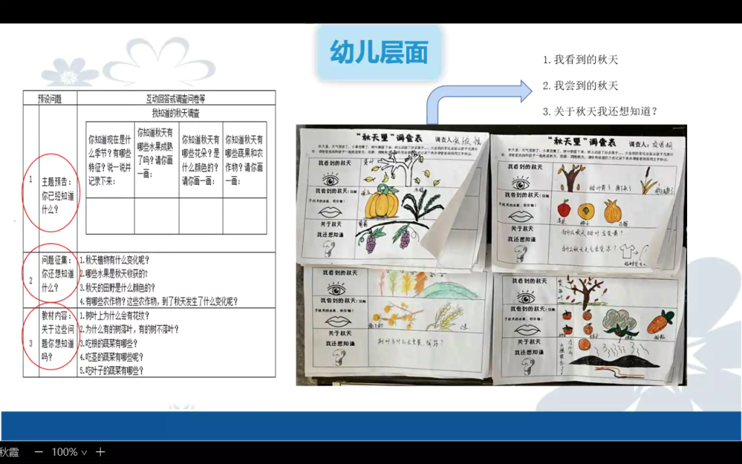 小班教研组分享的则是基于《秋天里》主题下的研思笃行。教研组通过主题、教师、幼儿层面入手进行主题的审议,而后从不同的主题故事、行动去探寻教师支持幼儿的行为和发展,最后通过评价对课程进行了整体的回应和诊断。