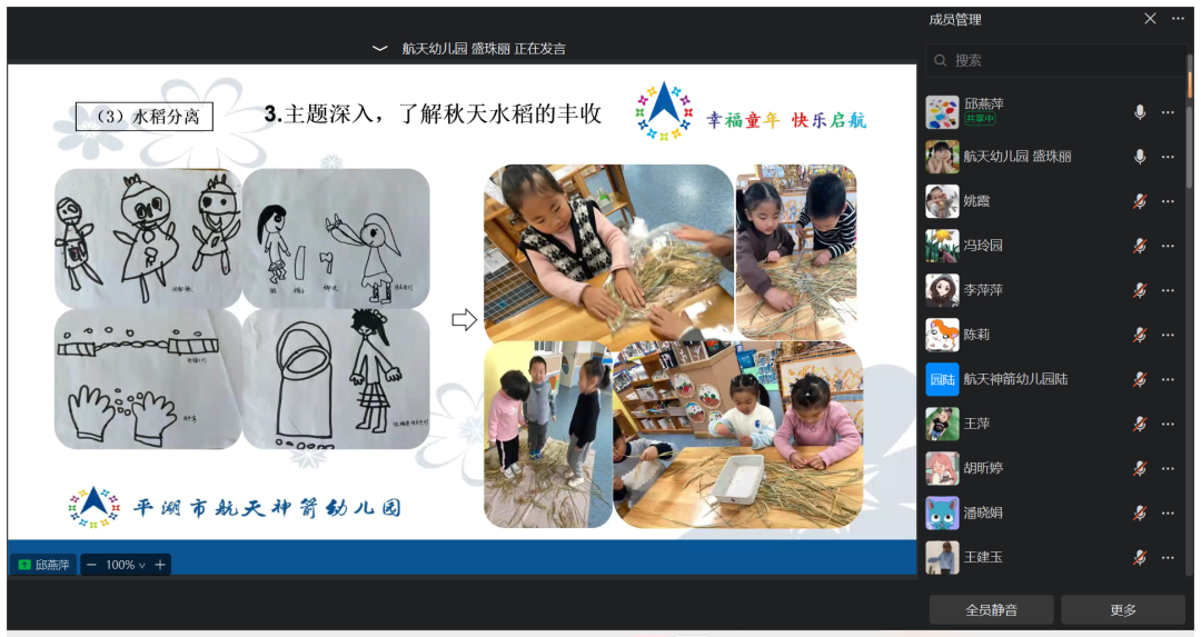 大班教研组基于主题《丰收的季节》进行分享和交流,老师们通过对主题中的脉络分析图、环创、目标、课程资源进行了教材的审议;又通过对水稻的生长过程、水稻如何变成大米、丰富的米制品以及寻找稻草有趣的玩法来对主题进行跟进,走进儿童,从而能够更好的对整个课程进行更合理的评价。