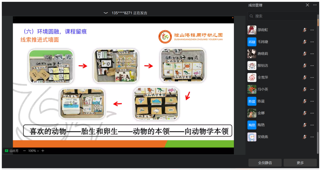 周圩教研组二组团队主要聚焦《动物》主题与大家分享了从“思”“行”“获”三大内容的课程实施。老师们基于儿童立场,从研习儿童、研内容、研资源、研目标、研评价等多维的角度进行分享。在课程实施的构成中,老师们始终追随每位儿童,从主题的共性点到个性点分别有效展开。在最后的评价中让在座的老师们也更加深知主题评价的重要性。