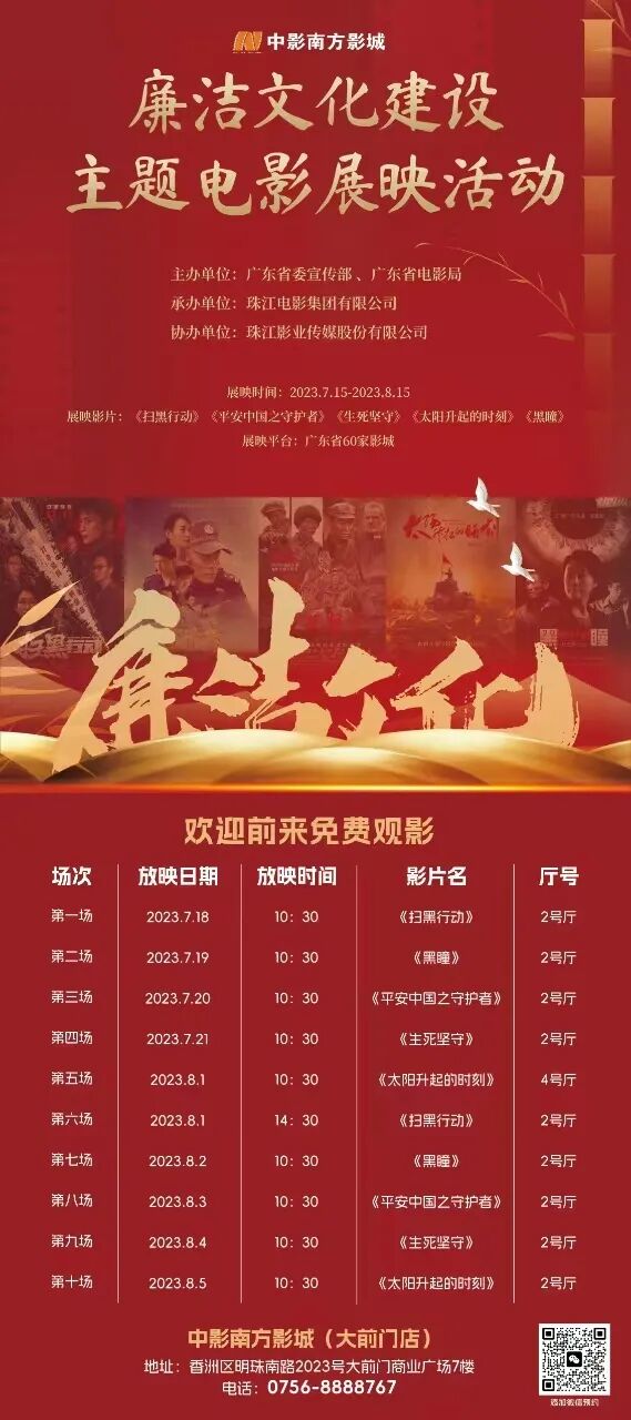 为扎实推进廉洁文化建设,让清廉之风润泽珠海,更好地将廉洁本色融入人民群众工作生活,在全社会营造风清气正、崇廉尚廉的浓厚氛围,近日,由广东省委宣传部、广东省电影局主办,珠江电影集团承办的“廉洁文化建设主题电影展映活动”即将在珠海拉开序幕。