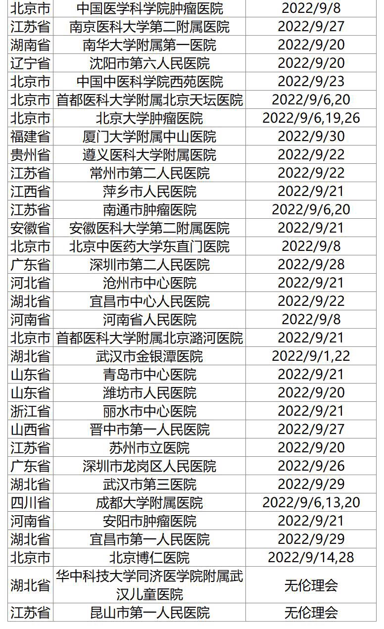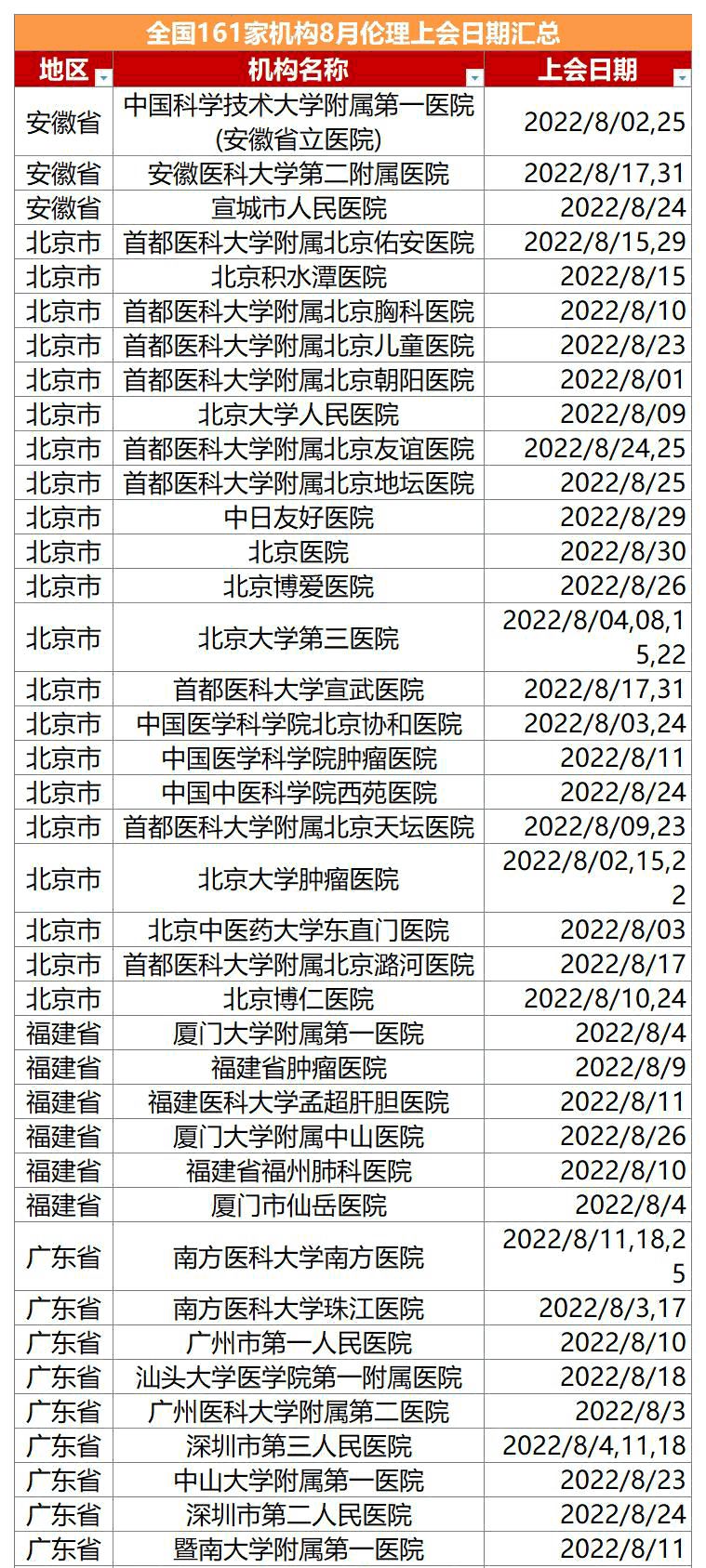 以下是本周公布的161家中心8月和76家中心9月伦理上会日期: