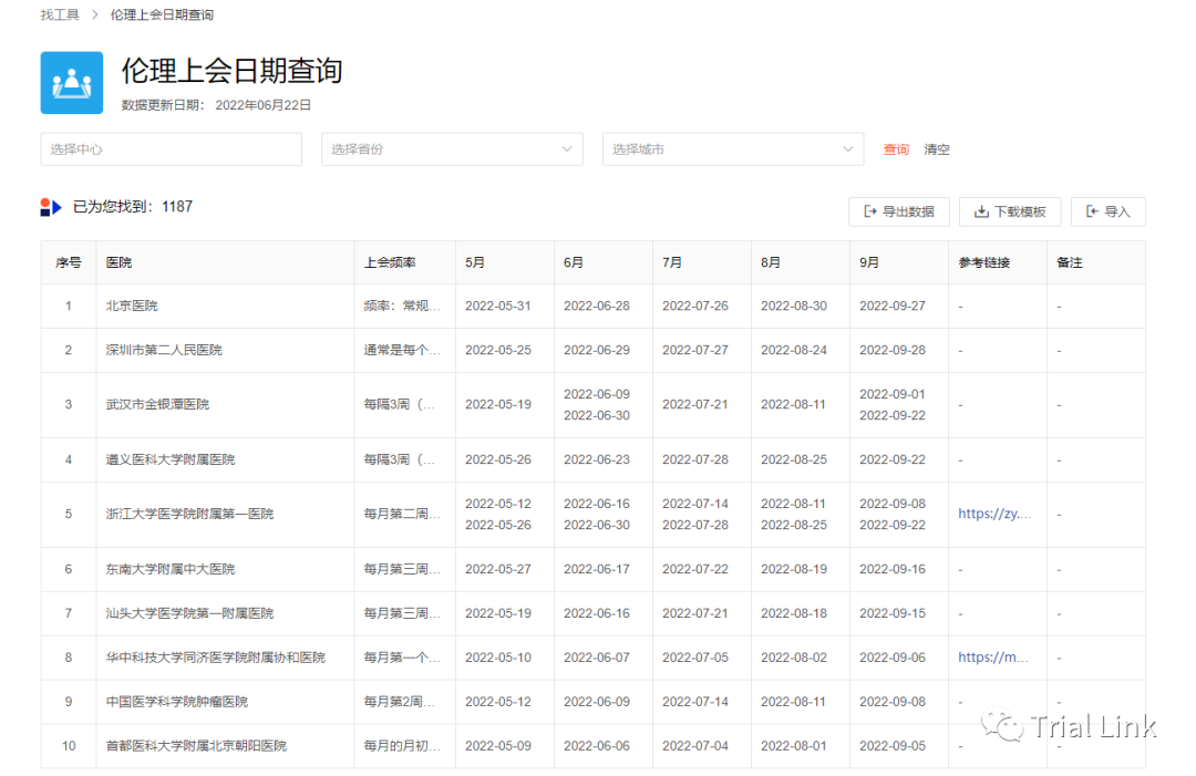 如何使用?第一步:访问https://www.trial.link,登录Trial.Link第二步:在【找工具】模块找到 【伦理上会日期查询】即可体验!