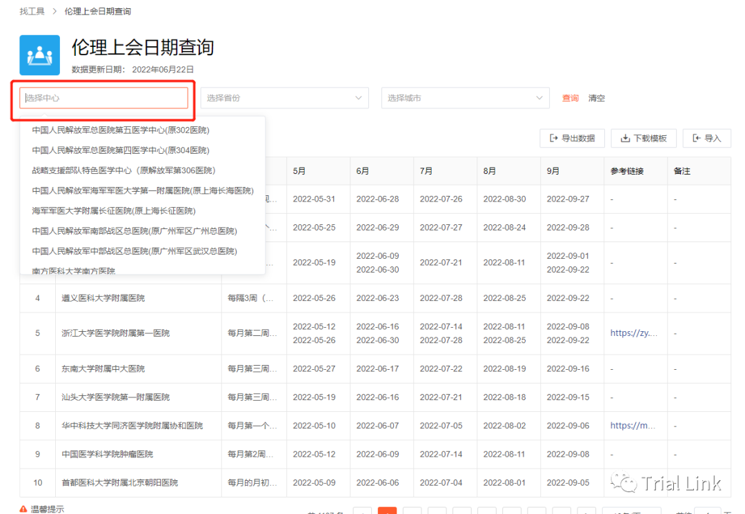 为了提前了解各家site伦理上会日期,我们在药研社APP上发起调研,向行业小伙伴们收集相应信息。每周,我们会将本周收集到的最新上会日期汇总,公布给大家除此之外,收集到的数据也会在Trial.Link平台中更新,通过【伦理上会日期查询】工具,输入中心名称即可查询,方便快捷!