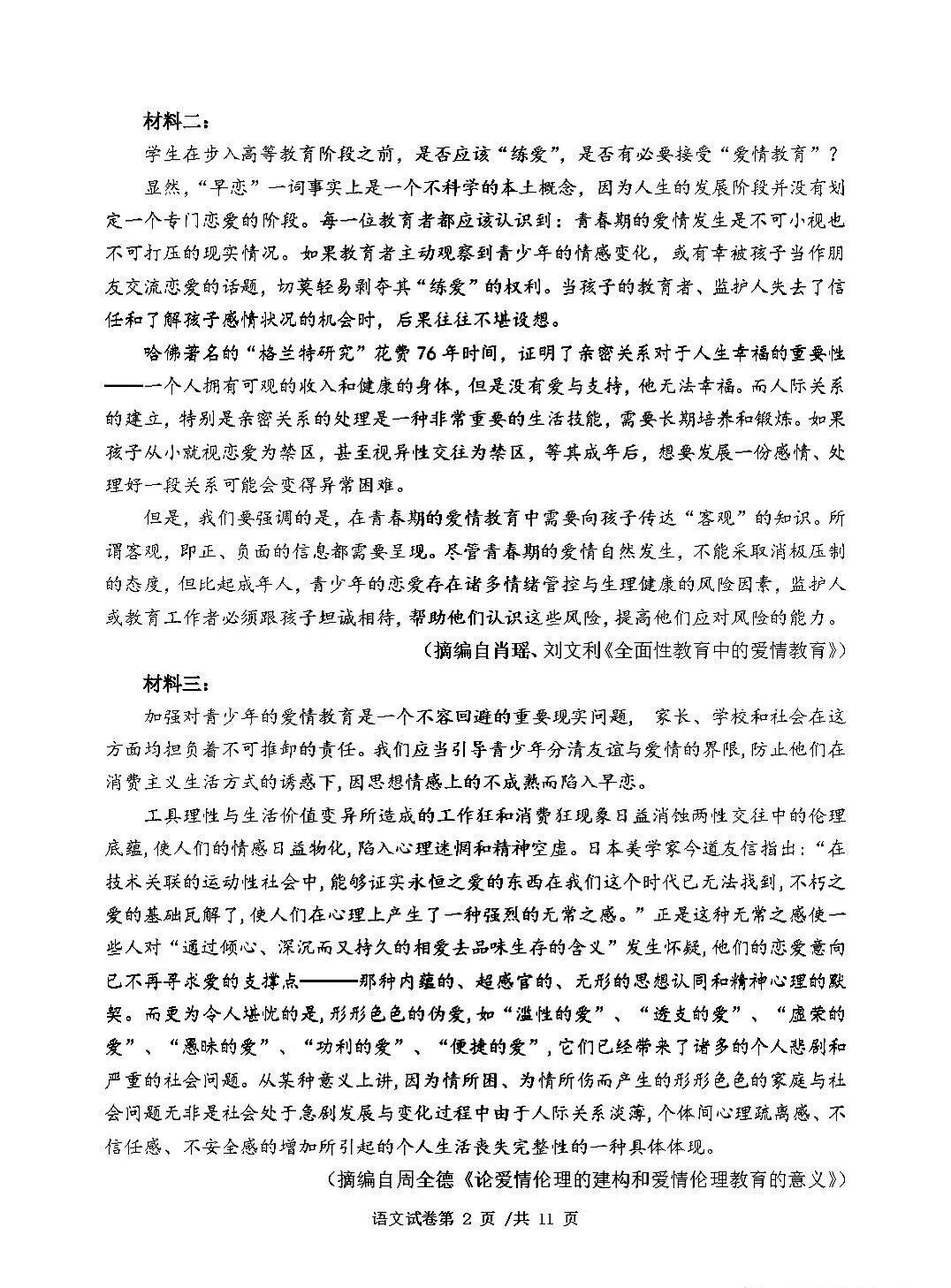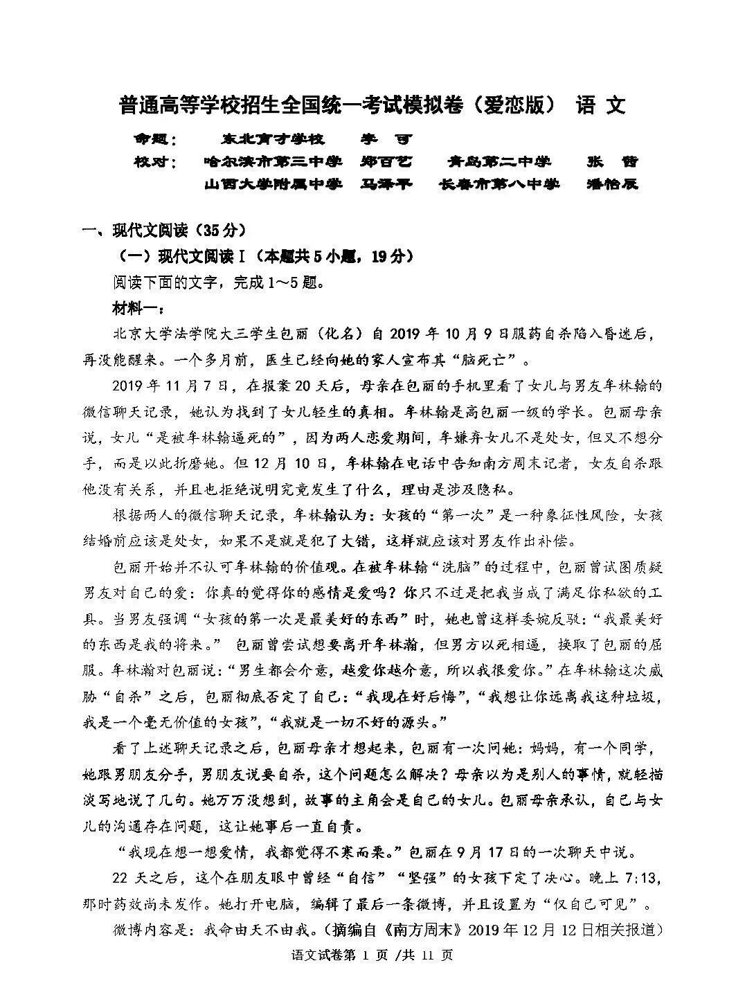 阅读下面的文字,完成1~5题。材料一:北京大学法学院大三学生包丽(化名)自2019年10月9日服药自杀陷入昏迷后,再没能醒来。一个多月前,医生已经向她的家人宣布其“脑死亡”。2019年11月7日,在报案20天后,母亲在包丽的手机里看了女儿与男友牟林翰的微信聊天记录,她认为找到了女儿轻生的真相。牟林翰是高包丽一级的学长。包丽母亲说,女儿“是被牟林翰逼死的”,因为两人恋爱期间,牟嫌弃女儿不是处女,但又不想分手,而是以此折磨她。但12月10日,牟林翰在电话中告知南方周末记者,女友自杀跟他没有关系,并且也拒绝说明究竟发生了什么,理由是涉及隐私。根据两人的微信聊天记录,牟林翰认为:女孩的“第一次”是一种象征性风险,女孩结婚前应该是处女,如果不是就是犯了大错,这样就应该对男友作出补偿。包丽开始并不认可牟林翰的价值观。在被牟林翰“洗脑”的过程中,包丽曾试图质疑男友对自己的爱:你真的觉得你的感情是爱吗?你只不过是把我当成了满足你私欲的工具。当男友强调“女孩的第一次是最美好的东西”时,她也曾这样委婉反驳:“我最美好的东西是我的将来。” 包丽曾尝试想要离开牟林瀚,但男方以死相逼,换取了包丽的屈服。牟林瀚对包丽说:“男生都会介意,越爱你越介意,所以我很爱你。”在牟林翰这次威胁“自杀”之后,包丽彻底否定了自己:“我现在好后悔”,“我想让你远离我这种垃圾,我是一个毫无价值的女孩”,“我就是一切不好的源头。”看了上述聊天记录之后,包丽母亲才想起来,包丽有一次问她:妈妈,有一个同学,她跟男朋友分手,男朋友说要自杀,这个问题怎么解决?母亲以为是别人的事情,就轻描淡写地说了几句。她万万没想到,故事的主角会是自己的女儿。包丽母亲承认,自己与女儿的沟通存在问题,这让她事后一直自责。“我现在想一想爱情,我都觉得不寒而栗。”包丽在9月17日的一次聊天中说。22天之后,这个在朋友眼中曾经“自信”“坚强”的女孩下定了决心。晚上7:13,那时药效尚未发作。她打开电脑,编辑了最后一条微博,并且设置为“仅自己可见”。微博内容是:我命由天不由我。(摘编自《南方周末》2019年12月12日相关报道)材料二:学生在步入高等教育阶段之前,是否应该“练爱”,是否有必要接受“爱情教育”?显然,“早恋”一词事实上是一个不科学的本土概念,因为人生的发展阶段并没有划定一个专门恋爱的阶段。每一位教育者都应该认识到:青春期的爱情发生是不可小视也不可打压的现实情况。如果教育者主动观察到青少年的情感变化,或有幸被孩子当作朋友交流恋爱的话题,切莫轻易剥夺其“练爱”的权利。当孩子的教育者、监护人失去了信任和了解孩子感情状况的机会时,后果往往不堪设想。哈佛著名的“格兰特研究”花费76年时间,证明了亲密关系对于人生幸福的重要性——一个人拥有可观的收入和健康的身体,但是没有爱与支持,他无法幸福。而人际关系的建立,特别是亲密关系的处理是一种非常重要的生活技能,需要长期培养和锻炼。如果孩子从小就视恋爱为禁区,甚至视异性交往为禁区,等其成年后,想要发展一份感情、处理好一段关系可能会变得异常困难。但是,我们要强调的是,在青春期的爱情教育中需要向孩子传达“客观”的知识。所谓客观,即正、负面的信息都需要呈现。尽管青春期的爱情自然发生,不能采取消极压制的态度,但比起成年人,青少年的恋爱存在诸多情绪管控与生理健康的风险因素,监护人或教育工作者必须跟孩子坦诚相待,帮助他们认识这些风险,提高他们应对风险的能力。 (摘编自肖瑶、刘文利《全面性教育中的爱情教育》)材料三:加强对青少年的爱情教育是一个不容回避的重要现实问题, 家长、学校和社会在这方面均担负着不可推卸的责任。我们应当引导青少年分清友谊与爱情的界限,防止他们在消费主义生活方式的诱惑下,因思想情感上的不成熟而陷入早恋。工具理性与生活价值变异所造成的工作狂和消费狂现象日益消蚀两性交往中的伦理底蕴,使人们的情感日益物化,陷入心理迷惘和精神空虚。日本美学家今道友信指出:“在 技术关联的运动性社会中,能够证实永恒之爱的东西在我们这个时代已无法找到,不朽之爱的基础瓦解了,使人们在心理上产生了一种强烈的无常之感。”正是这种无常之感使一些人对“通过倾心、深沉而又持久的相爱去品味生存的含义”发生怀疑,他们的恋爱意向已不再寻求爱的支撑点———那种内蕴的、超感官的、无形的思想认同和精神心理的默契。而更为令人堪忧的是,形形色色的伪爱,如“滥性的爱”、“透支的爱”、“虚荣的爱”、“愚昧的爱”、“功利的爱”、“便捷的爱”,它们已经带来了诸多的个人悲剧和严重的社会问题。从某种意义上讲,因为情所困、为情所伤而产生的形形色色的家庭与社会问题无非是社会处于急剧发展与变化过程中由于人际关系淡薄,个体间心理疏离感、不信任感、不安全感的增加所引起的个人生活丧失完整性的一种具体体现。(摘编自周全德《论爱情伦理的建构和爱情伦理教育的意义》)1. 下列对材料相关内容的理解和分析,正确的一项是(3分)A. 根据材料二的论述,我们可以推断,正是母亲对爱情教育的避讳与忽视直接导致了包丽自杀的悲剧。B. “格兰特研究”证明了“早恋”的必要性,因为孩
