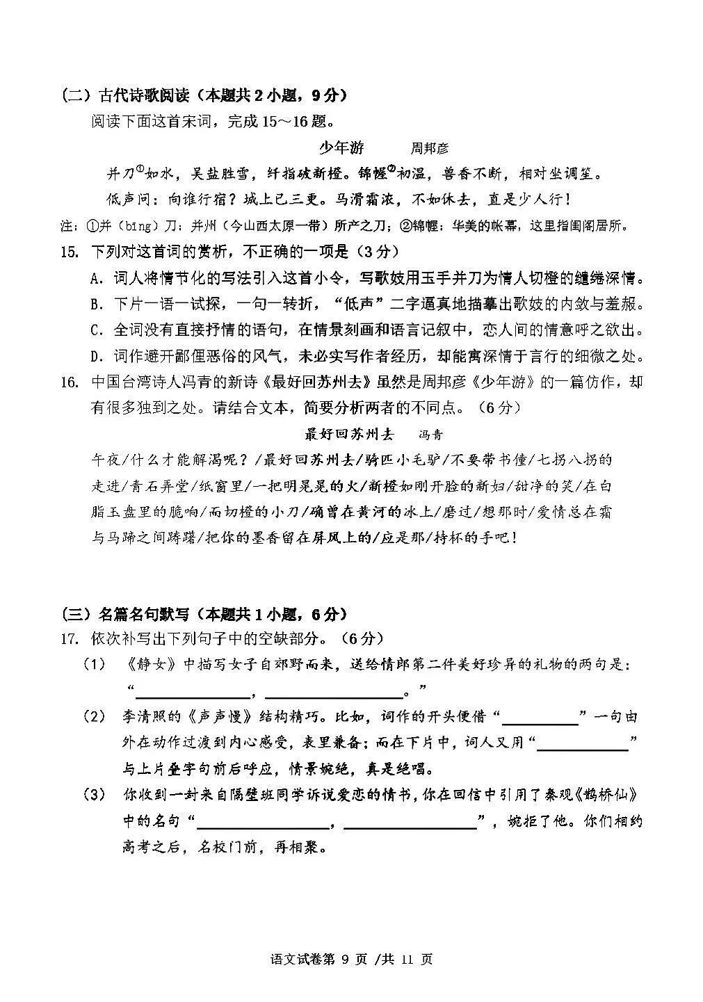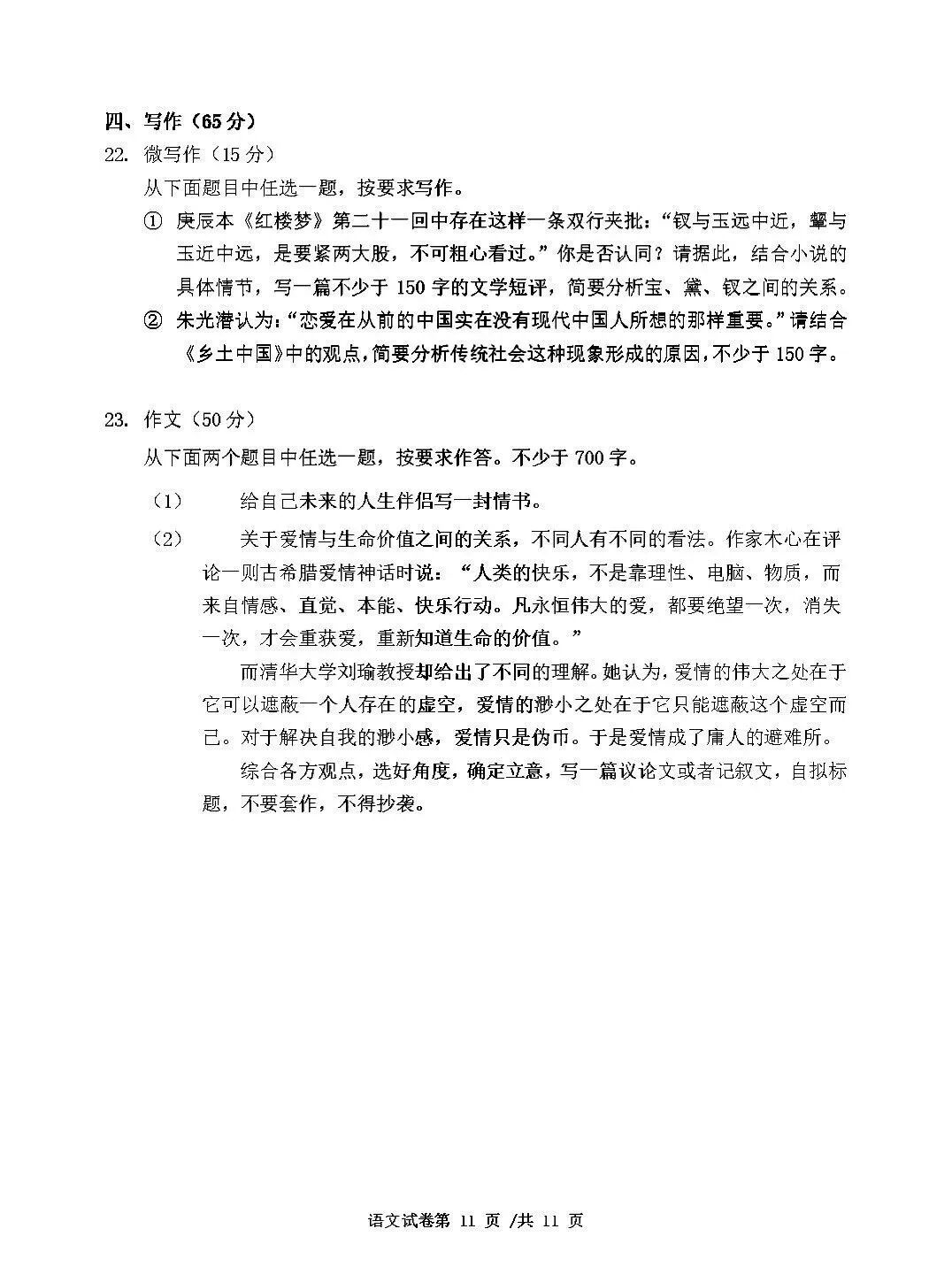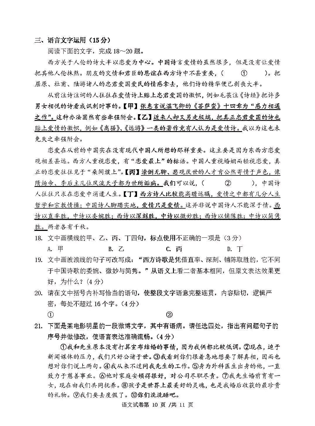 18. 文中画横线的甲、乙、丙、丁四句,标点使用不正确的一项是(3分)A. 甲 B. 乙 C. 丙 D. 丁19. 文中画波浪线的句子可改写成:“西方诗歌是凭借直率、深刻、铺陈取胜的,它不同于中国诗歌的委婉、微妙与简隽。”从语义上看二者基本相同,但原文表达效果更好,为什么?(4分) 20. 请在文中括号内补写恰当的语句,使整段文字语意完整连贯,内容贴切,逻辑严密,每处不超过16个字。(4分)①______________ ②______________21. 下面是某电影明星的一段微博文字,其中有四处语病。请指出有问题句子的序号并做修改,使语言表达准确流畅。(4分)①我和先生原本没有打算宣布结婚的事情,因为我俩都比较低调。②现在,迫于新闻媒体的压力,我们只好公诸于世。③我看到你们很着急地想要了解真相,因而也想对你们说上两句。④我从来不过问我先生的工作。⑤身为外科医生出身的他,一直致力于慈善事业。⑥他对家庭安顿得很好,对公司尽职尽责。⑦我先生婚前育有一女,现在由我们共同抚养。⑧孩子是世界上最美好的灵魂,也是我婚后收获的最珍贵的礼物。⑨我们要去度假了。⑩你们洗洗睡吧。四、写作(65分)22. 微写作(15分)从下面题目中任选一题,按要求写作。① 庚辰本《红楼梦》第二十一回中存在这样一条双行夹批:“钗与玉远中近,颦与玉近中远,是要紧两大股,不可粗心看过。”你是否认同?请据此,结合小说的具体情节,写一篇不少于150字的文学短评,简要分析宝、黛、钗之间的关系。② 朱光潜认为:“恋爱在从前的中国实在没有现代中国人所想的那样重要。”请结合《乡土中国》中的观点,简要分析传统社会这种现象形成的原因,不少于150字。 23. 作文(50分)从下面两个题目中任选一题,按要求作答。不少于700字。(1) 给自己未来的人生伴侣写一封情书。(2) 关于爱情与生命价值之间的关系,不同人有不同的看法。作家木心在评论一则古希腊爱情神话时说:“人类的快乐,不是靠理性、电脑、物质,而来自情感、直觉、本能、快乐行动。凡永恒伟大的爱,都要绝望一次,消失一次,才会重获爱,重新知道生命的价值。”而清华大学刘瑜教授却给出了不同的理解。她认为,爱情的伟大之处在于它可以遮蔽一个人存在的虚空,爱情的渺小之处在于它只能遮蔽这个虚空而已。对于解决自我的渺小感,爱情只是伪币。于是爱情成了庸人的避难所。综合各方观点,选好角度,确定立意,写一篇议论文或者记叙文,自拟标题,不要套作,不得抄袭。
