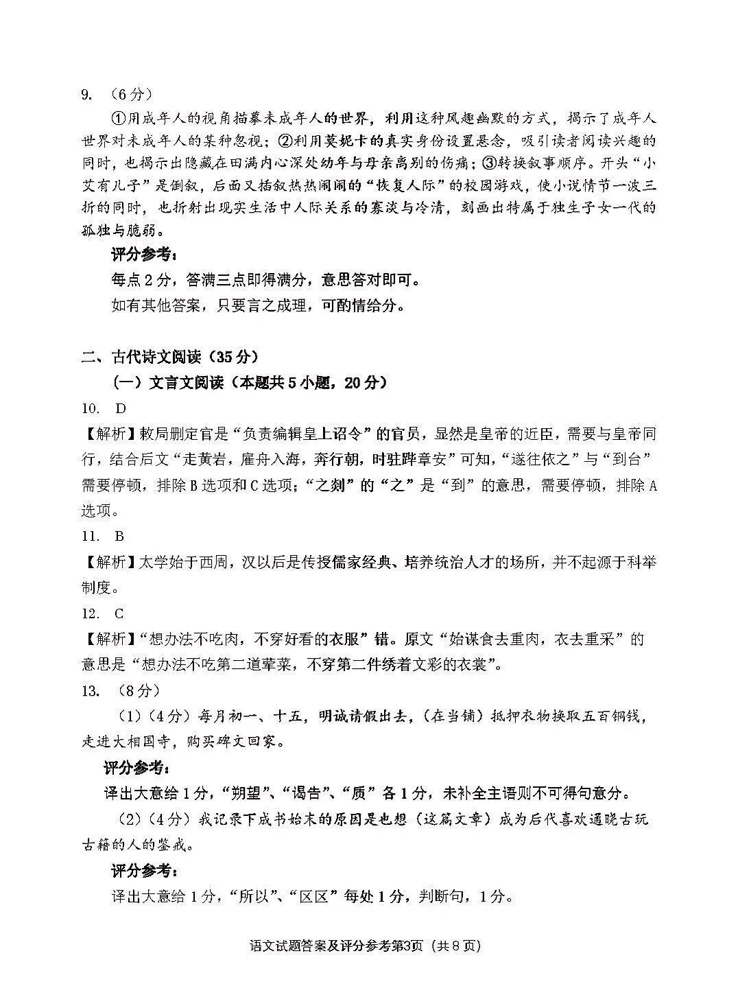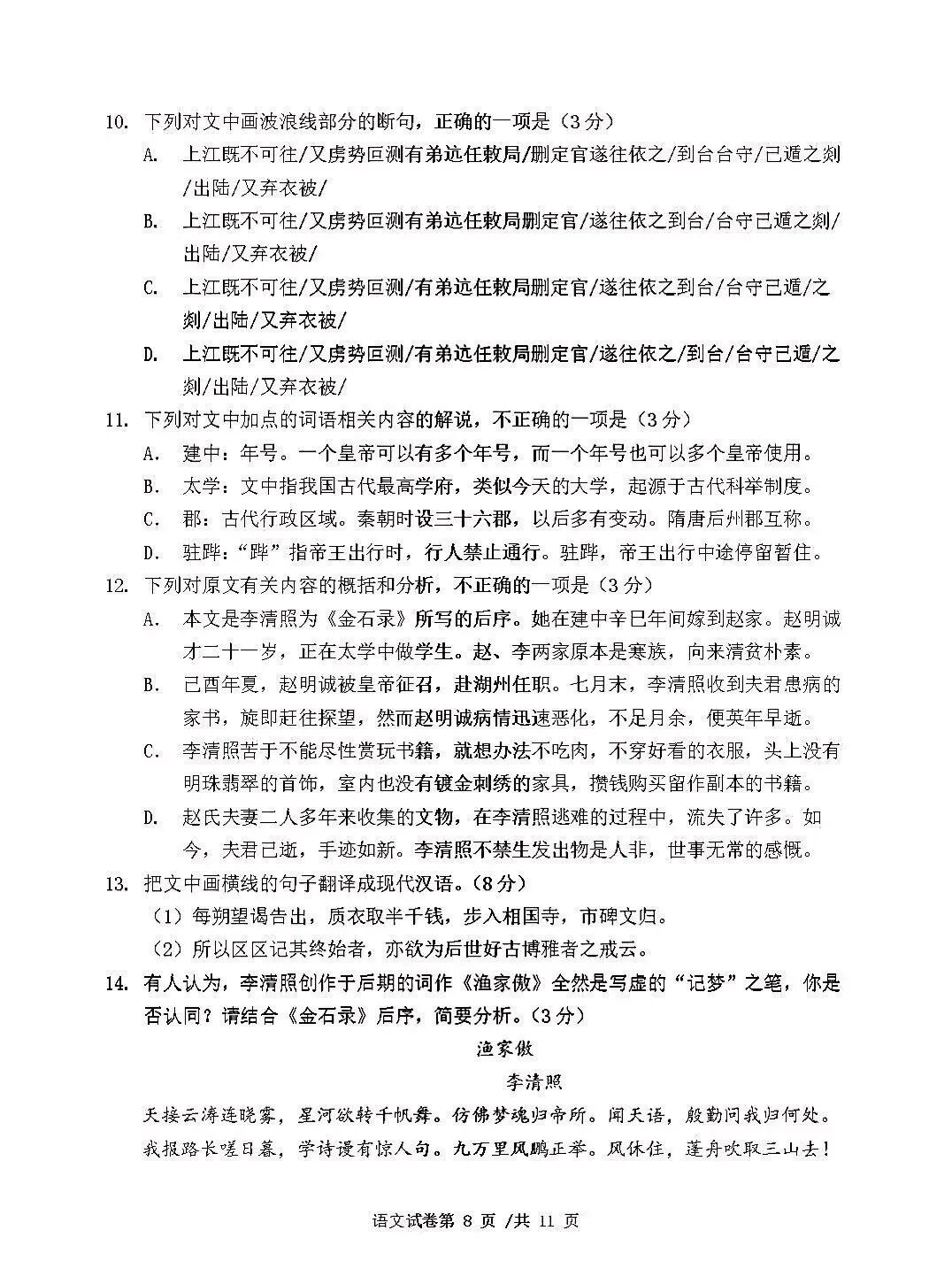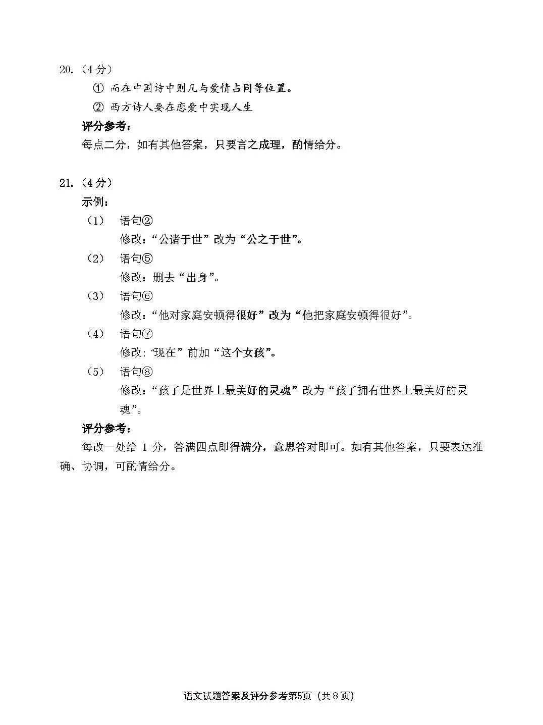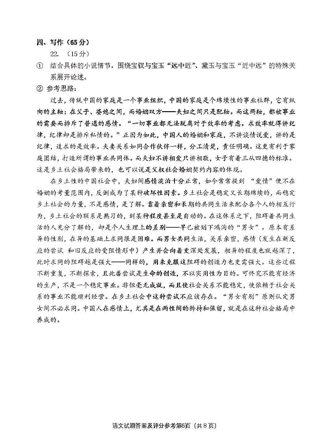 18. 文中画横线的甲、乙、丙、丁四句,标点使用不正确的一项是(3分)A. 甲 B. 乙 C. 丙 D. 丁19. 文中画波浪线的句子可改写成:“西方诗歌是凭借直率、深刻、铺陈取胜的,它不同于中国诗歌的委婉、微妙与简隽。”从语义上看二者基本相同,但原文表达效果更好,为什么?(4分) 20. 请在文中括号内补写恰当的语句,使整段文字语意完整连贯,内容贴切,逻辑严密,每处不超过16个字。(4分)①______________ ②______________21. 下面是某电影明星的一段微博文字,其中有四处语病。请指出有问题句子的序号并做修改,使语言表达准确流畅。(4分)①我和先生原本没有打算宣布结婚的事情,因为我俩都比较低调。②现在,迫于新闻媒体的压力,我们只好公诸于世。③我看到你们很着急地想要了解真相,因而也想对你们说上两句。④我从来不过问我先生的工作。⑤身为外科医生出身的他,一直致力于慈善事业。⑥他对家庭安顿得很好,对公司尽职尽责。⑦我先生婚前育有一女,现在由我们共同抚养。⑧孩子是世界上最美好的灵魂,也是我婚后收获的最珍贵的礼物。⑨我们要去度假了。⑩你们洗洗睡吧。四、写作(65分)22. 微写作(15分)从下面题目中任选一题,按要求写作。① 庚辰本《红楼梦》第二十一回中存在这样一条双行夹批:“钗与玉远中近,颦与玉近中远,是要紧两大股,不可粗心看过。”你是否认同?请据此,结合小说的具体情节,写一篇不少于150字的文学短评,简要分析宝、黛、钗之间的关系。② 朱光潜认为:“恋爱在从前的中国实在没有现代中国人所想的那样重要。”请结合《乡土中国》中的观点,简要分析传统社会这种现象形成的原因,不少于150字。 23. 作文(50分)从下面两个题目中任选一题,按要求作答。不少于700字。(1) 给自己未来的人生伴侣写一封情书。(2) 关于爱情与生命价值之间的关系,不同人有不同的看法。作家木心在评论一则古希腊爱情神话时说:“人类的快乐,不是靠理性、电脑、物质,而来自情感、直觉、本能、快乐行动。凡永恒伟大的爱,都要绝望一次,消失一次,才会重获爱,重新知道生命的价值。”而清华大学刘瑜教授却给出了不同的理解。她认为,爱情的伟大之处在于它可以遮蔽一个人存在的虚空,爱情的渺小之处在于它只能遮蔽这个虚空而已。对于解决自我的渺小感,爱情只是伪币。于是爱情成了庸人的避难所。综合各方观点,选好角度,确定立意,写一篇议论文或者记叙文,自拟标题,不要套作,不得抄袭。