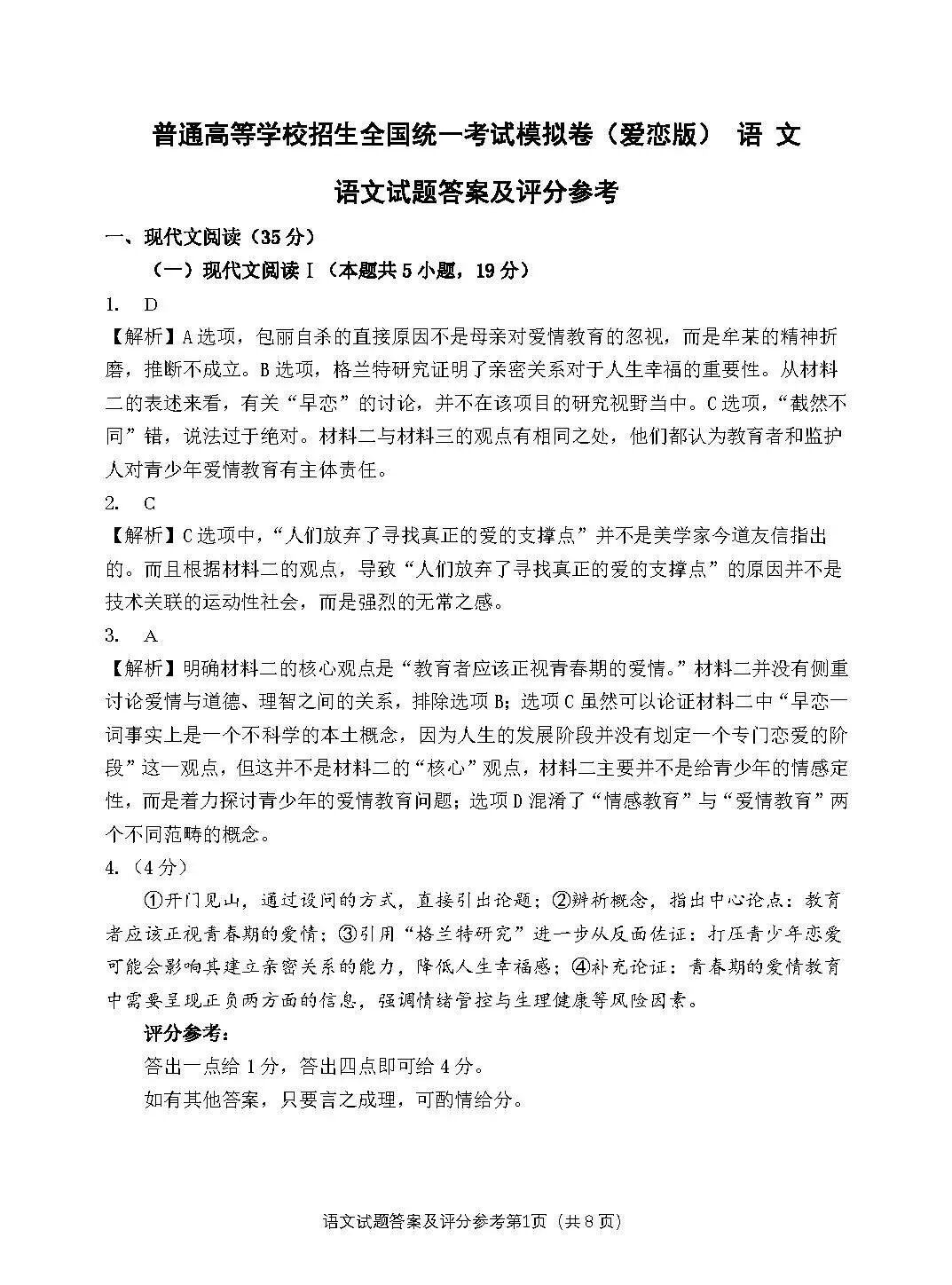 正是着眼于此,我们研制了一套爱情选材的语文模拟试卷。显然,它并不是单纯地以应试为目标而设计的一套测评工具,试卷对学生的读写与思辨能力的考察也远高于高考标准。虽然题目的选材与设问角度严格遵循了2017版新课标“立德树人”的指导意见与最新颁布的高考评价体系相关文件,力破套式,颇具实验性;但我们并不希望本套试卷仅仅止步于一场考试,我们更希望它是以一节课的形式被呈现出来的,希望它能够成为我们与学生共同研讨“爱情”——这一看上去颇为禁忌的话题——的开放性平台。