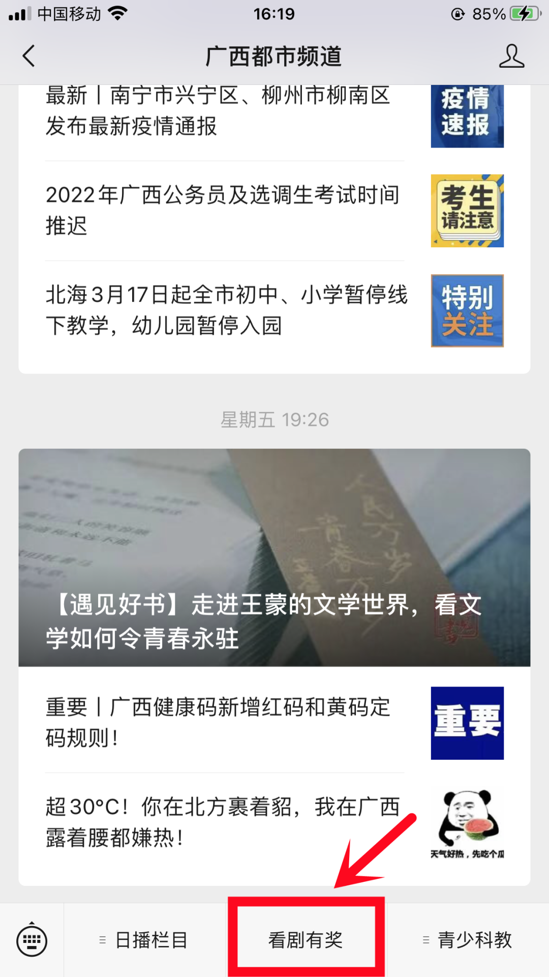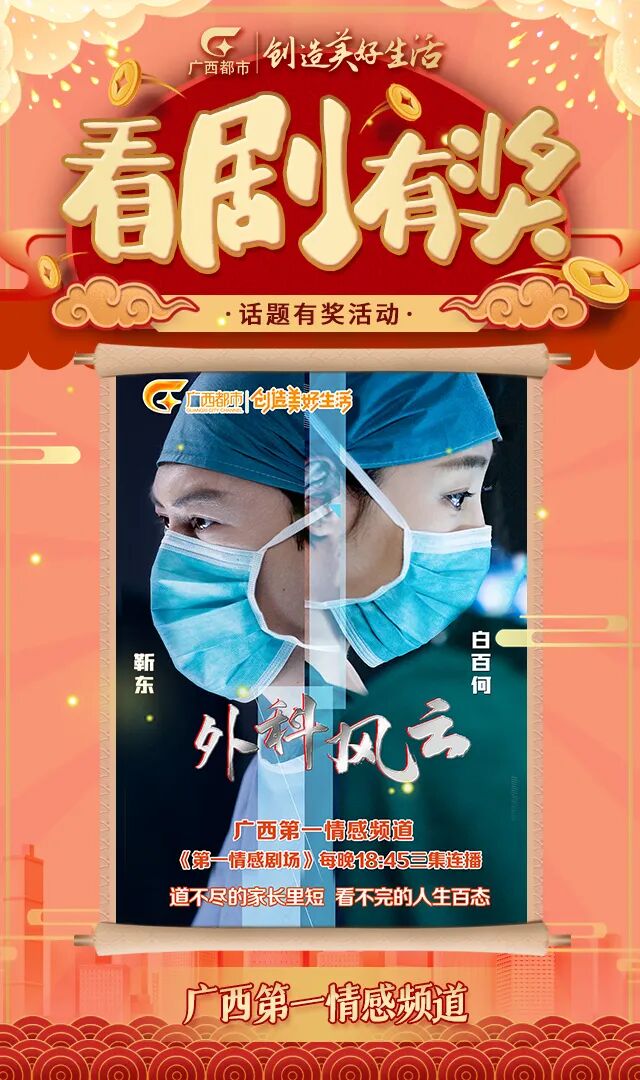 关注微信公众号“广西都市频道”,点击子菜单“看剧有奖”,即可参与话题H5有奖互动。每三天从所有话题评论或电视剧剧评中评选出“微波炉大奖”一台。评论精彩,发得越多中奖几率越高哦。(中奖信息将在电视剧走字及微信公众号“广西都市频道”公布)。