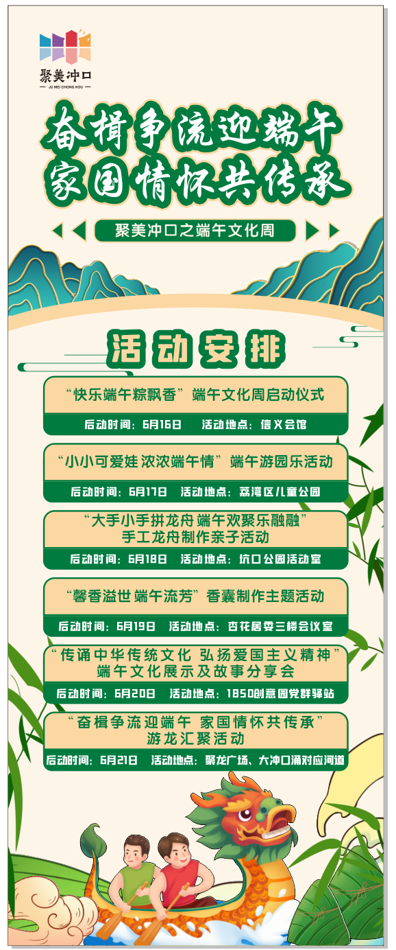 “奋楫争流迎端午,家国情怀共传承”——聚美冲口之端午文化周系列活动即将重磅来袭!6月16日至21日,冲口街道将连续举办赛龙舟、包粽子、缝香包等端午传统文化体验活动。