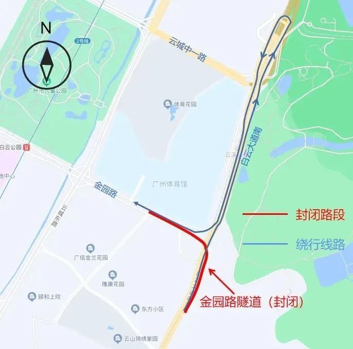 为推进地铁十二号线建设,施工单位计划于2023年6月16日22时至2023年12月15日对白云大道南路金园路隧道进行封闭施工。届时,金园路隧道将封闭,过往车辆需在白云大道南路与云城中一路交汇处北侧掉头绕行至金园路。本次围蔽施工对地面行车无影响,请过往车辆留意。具体施工区域交通组织示意图如下: