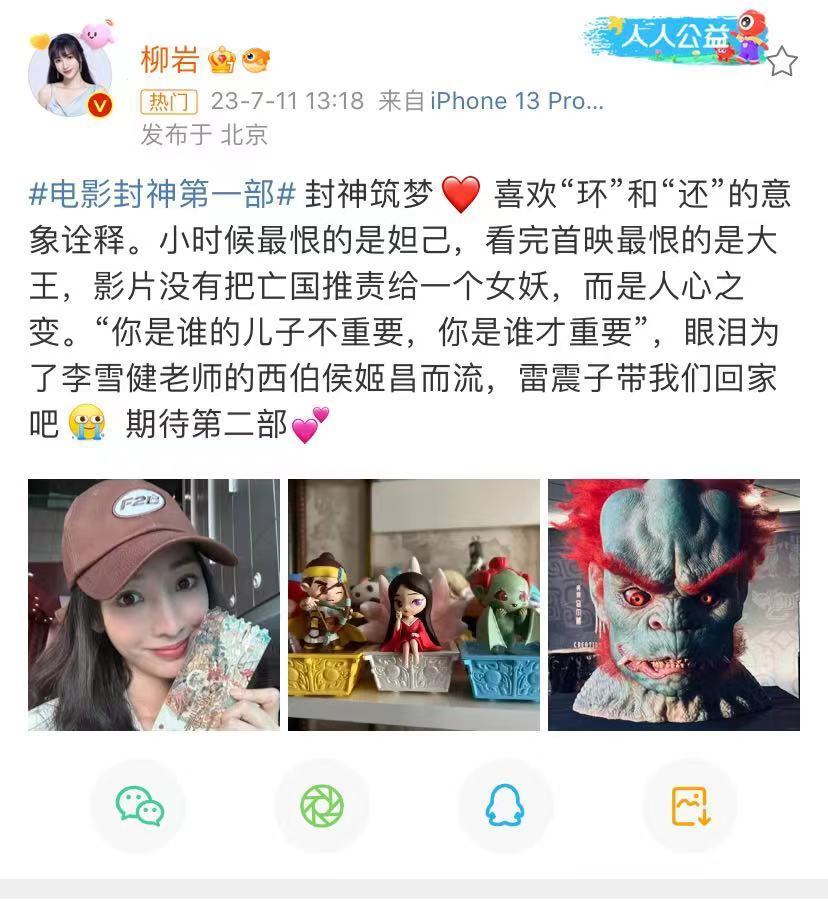 柳岩看了首映,表示电影似乎为妲己更名,亡国不是女妖,而是人心的变化。李雪健饰演的姬昌也是很感人,期待第二部。