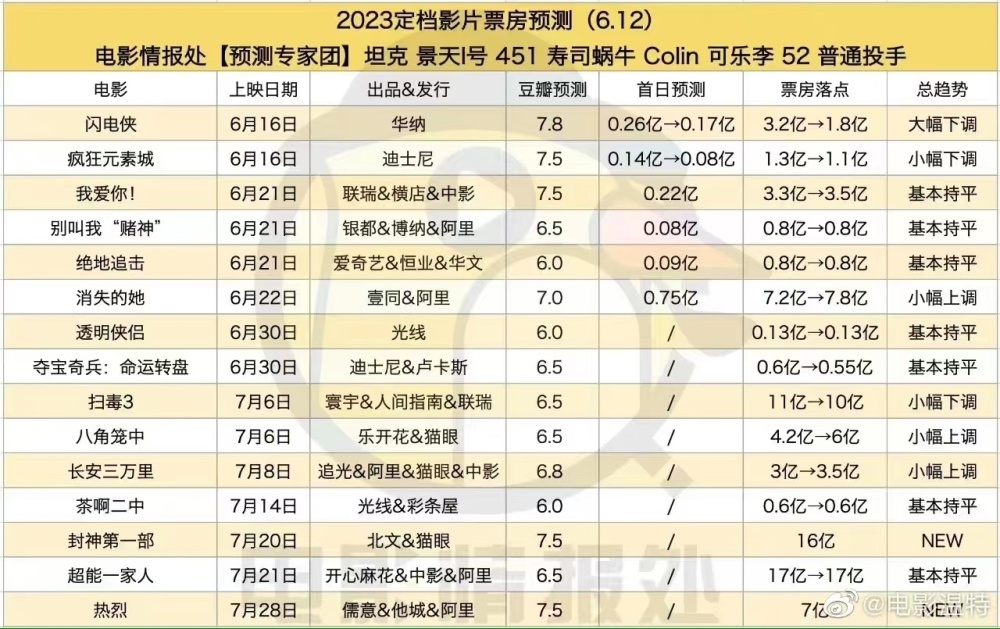 暑期档的媒体映前预测似乎都已经翻车,特别《消失的她》预测7亿多,结果已经31亿,后来调整为33亿,而《八角笼中》票房预测是7亿,结果已经破了10亿,调整为19亿票房,八天后《封神第一部》即将上映,目前有预测是16亿。