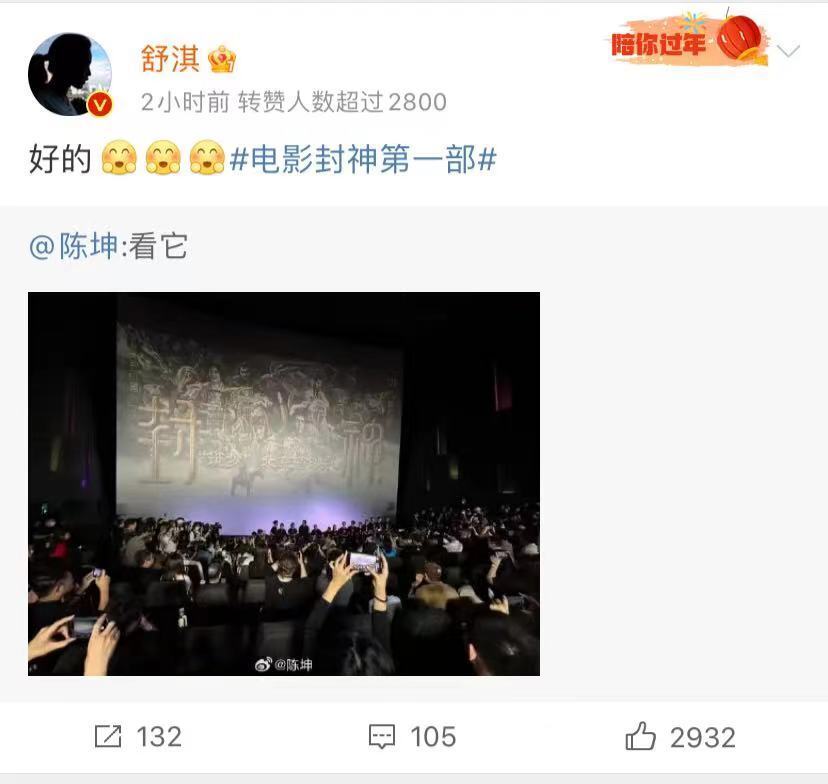 舒淇也转发了陈坤的微博,可能会为好友包场看片。