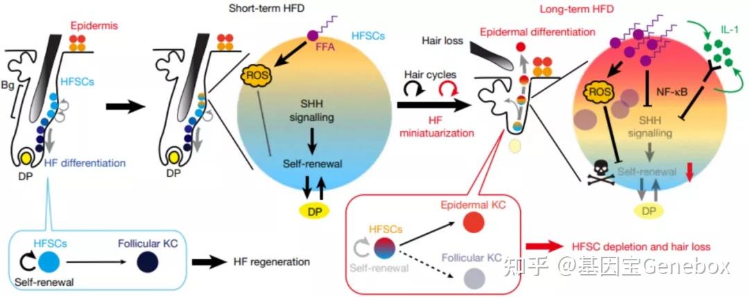 与此同时,毛囊干细胞代谢高脂饮食中的游离脂肪酸,产生大量活性氧,导致细胞内氧化应激水平上升,而IL-1R通路会放大这种氧化应激损伤,导致毛囊干细胞的炎性衰老。只要几个生发周期下来,毛囊干细胞就被迅速清除了。