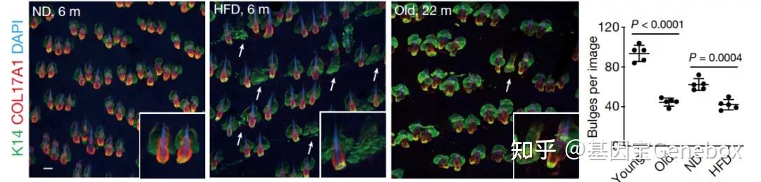 作者对毛囊进行研究后发现,肥胖和老年小鼠的毛囊干细胞所处的毛囊隆突部变少了,原本毛囊干细胞就数量较少的小毛囊也明显减少,毛囊的生发周期还比正常情况下缩短了。