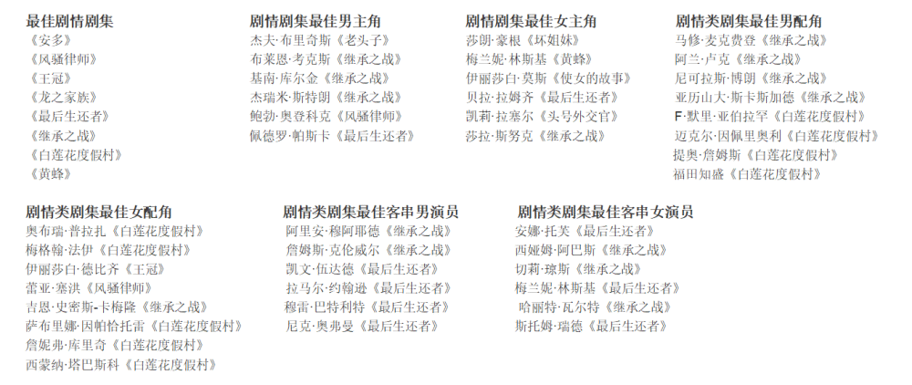 今年艾美奖获得提名最多的三部剧集均来自于HBO:《继承者之战》28项提名、《最后生还者》24项提名、《白莲花度假村》第二季23项提名;其中剧情类剧集最佳男配角提名被《继承者之战》与《白莲花度假村》包揽。