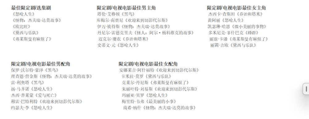 2023年艾美奖限定剧/选集剧类奖项提名: