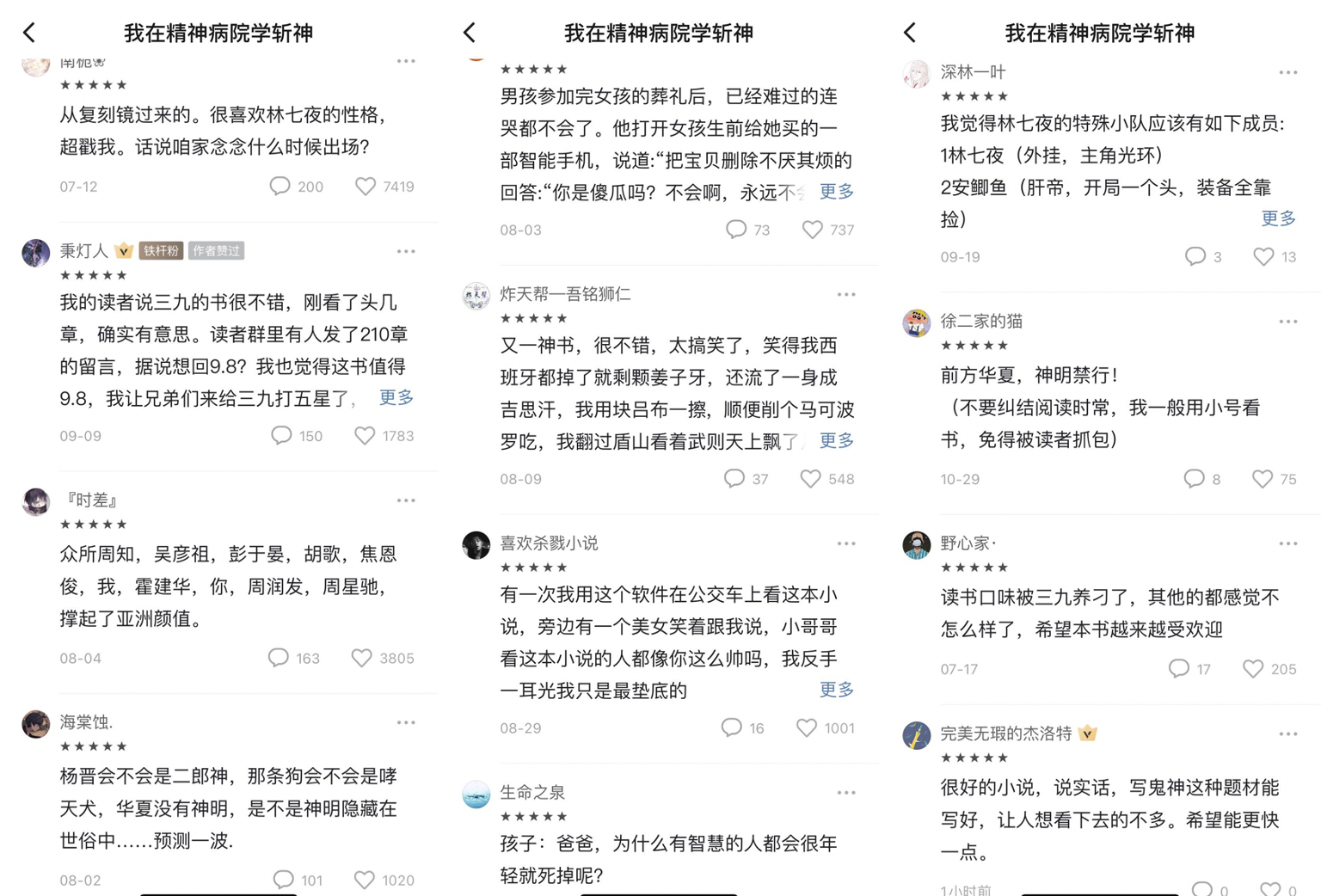 作者三九音域:嗯……这本书的书名确实有点劝退,我不是很擅长起名字,这一点已经有很多读者朋友们意识到了。但在一开始的时候,我也曾给这本书想过很多不一样的名字,比如《踏夜斩神》,《我自夜中来》,或者《七神》这种比较传统的书名,但是在扫过网站的榜单之后,我发现绝大部分排在前列的书名都是很具备辨识度的,让人看一眼就能知道书里讲的是什么,所以我就放弃了这些名字,选择了《我在精神病院学斩神》这个能够凸显出本书主题的名字,它也确实吸引了一部分喜欢这个主题的读者。