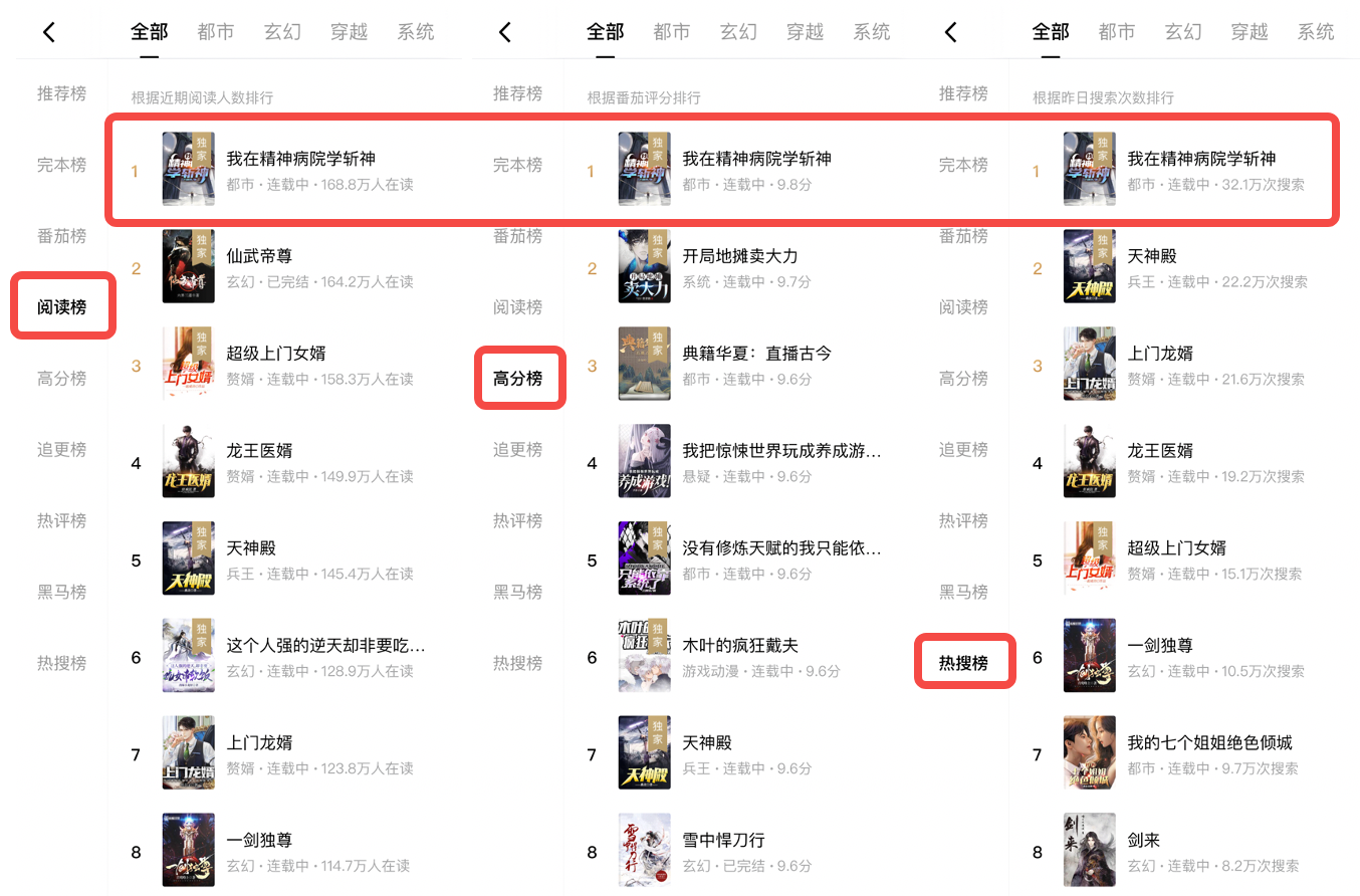 10万字测试日,这本书的日收入达到500元,完读率达到12%,第二天达到21%,之后一直在稳步增长。再后来,这本书获得了很多抖音博主的自发推荐,使它真正成为爆款。站内搜索和排名暴涨,30万字时就登上了高分榜第一。很不容易,但也在我意料之中!