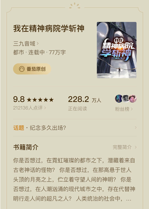 看到这里,或许你已经对《我在精神病院学斩神》这本书背后的创作故事和爆火过程有了更多了解了吧,欢迎上番茄小说APP免费阅读本书,也欢迎大家构思自己的作品投稿给番茄编辑!