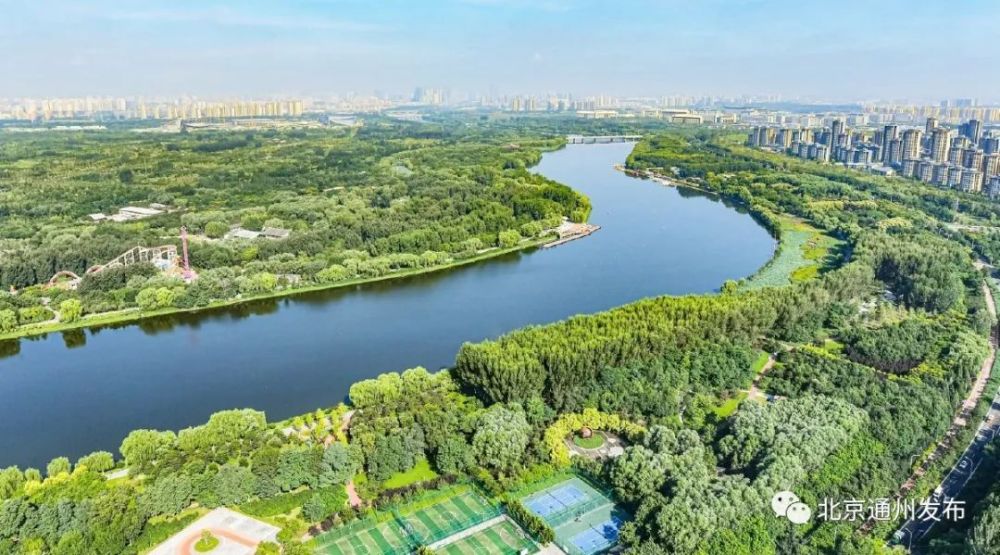 从天空俯瞰城市副中心,运河穿行于高楼大厦间,宛如一条蓝色丝带,城市绿心森林公园则是系在丝带上的一颗碧绿翡翠。