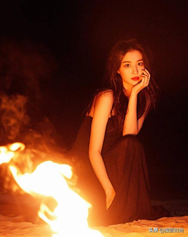 一身黑裙的王楚然在篝火前随便一拍就充满氛围感。