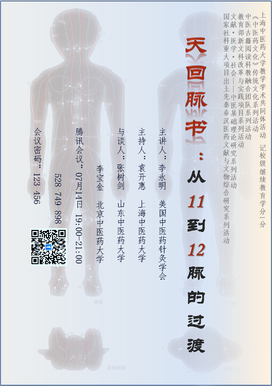 鉴于此,《中医药文化》杂志、上海中医药大学国家社科重大项目“先秦秦汉医药文献与文物综合研究”团队、教育部新文科改革与实践团队、中医古籍阅读科教融合团队、中医基础理论研究团队试打破学科壁垒,举办传统文化研读活动。于7月14日(周五)晚,特邀美国中医药针灸学会李永明老师主讲,山东中医药大学张树剑老师、北京中医药大学李宝金老师与谈,通过腾讯会议与您讲座分享“天回脉书:从11-12脉的过渡”。