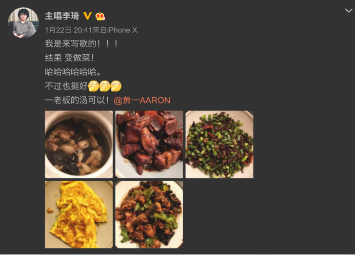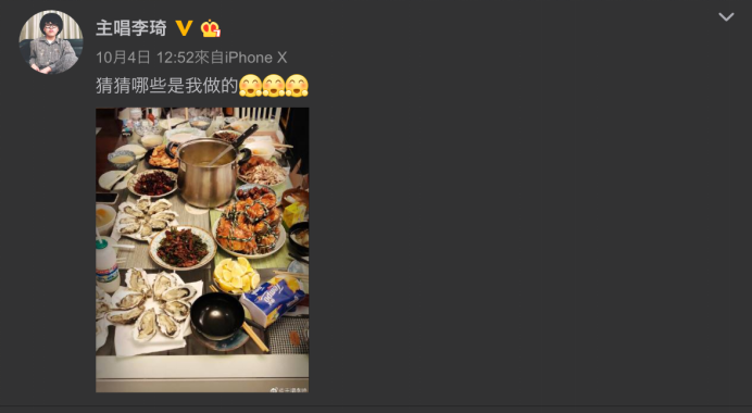 而另一边,虽然没有“英年早婚”的李琦却似乎沉迷于做菜,微博偶尔晒出来的家常菜也是十足丰盛,让人口水连连: