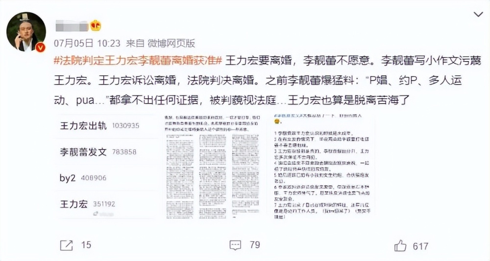 后来王力宏和李靓蕾闹离婚,而李靓蕾为了能够让自己在舆论上占据上风,在微博上发了很多篇小作文,把王力宏的良好形象给彻底撕烂,其中就曝出过多人运动,隐射过陈建州、范玮琪和徐若瑄。