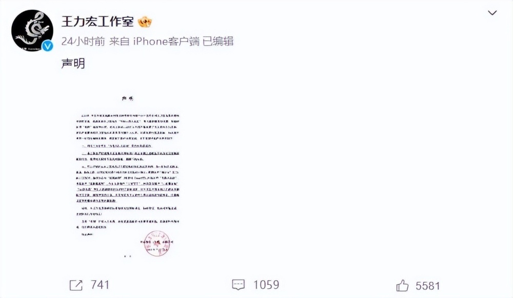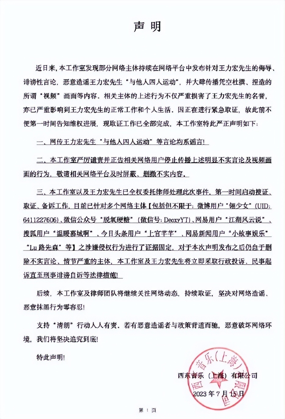 近日,王力宏工作室在没有任何预告的情况下,突然通过微博对外发布声明,表示将会针对恶意造谣诽谤王力宏与他人四人运动的网络用户,进行了紧急取证,将会采取法律手段维权到底。