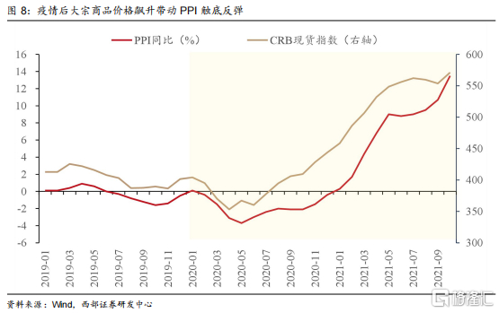 本轮PPI回升主要受新冠疫情爆发以及逆全球化浪潮影响。疫情影响了大宗商品的供求和流动性格局,从而推动大宗商品价格快速上行。同时,欧美等国为应对疫情对经济的消极影响,大量向市场投放流动性,美联储在2020年3月用一个多月的时间重启2008年金融危机后的全部应对政策工具,并推出了新的无限量量化宽松加上零利率政策,导致美元大幅贬值,进一步推动大宗商品价格抬升。