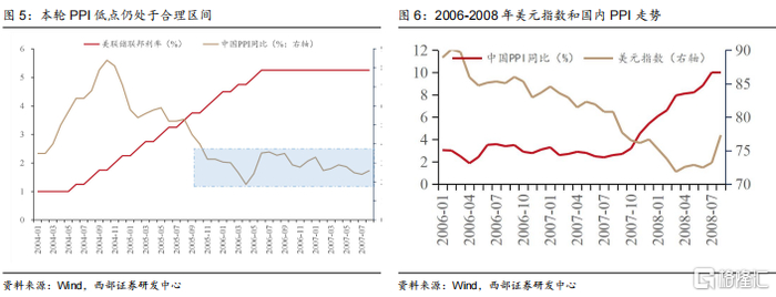 本轮PPI底部仍处于合理水平。与其他几轮PPI探底行情不同,第二轮PPI低点仍达1.64%,处于合理区间。此前为了控制通胀及过热的房地产市场,美联储在2004-2006年两年共进行了17次加息,将联邦基金利率从1%抬升至5.25%的历史高点,紧缩的货币政策也导致欧美等发达国家需求回落。但受益于全球化带来的红利,以中国为首的新兴国家经济发展与发达国家表现出现分化,新兴国家的高速发展填补了欧美发达国家衰退导致的需求空缺,支撑全球大宗商品价格维持正常水平,因此本轮PPI探底期间中国经济整体维持高增长+合理通胀的运行态势。直至2008年金融危机导致美元加速贬值,大宗商品价格暴涨,中国PPI才重回高位。