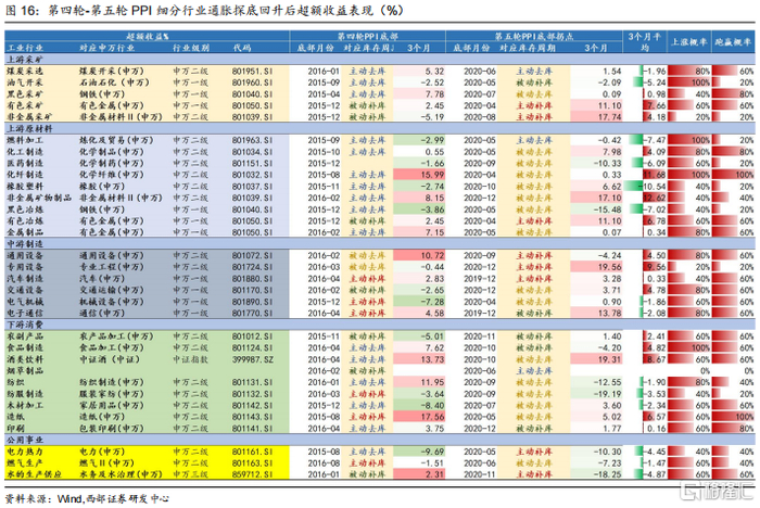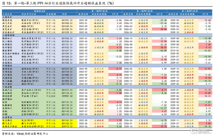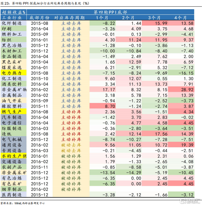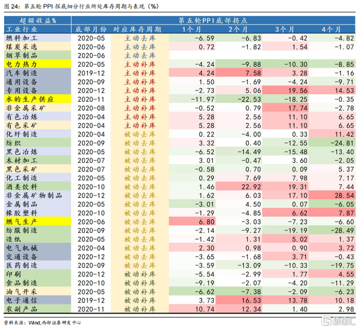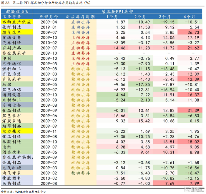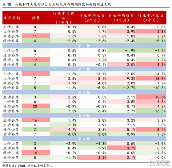 考虑到各个细分行业PPI探底时间对应库存周期也均不相同。我们分别统计了过去各轮细分行业PPI见底回升时所处库存周期阶段以及对应表现,从而探寻细分行业PPI表现分化与所处库存周期的关系。