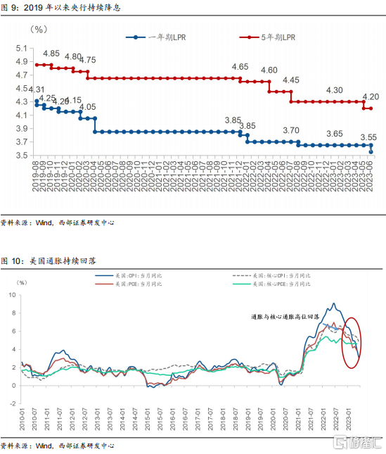 当前PPI上行已具备一定条件,后续有望触底回升。从历史复盘来看,在过去1-3轮PPI触底反弹前,宏观经济环境往往是国内宽松货币政策+海外流动性释放。国内政策方面,近年来央行持续降准降息,一年期、五年期LPR分别较2019年8月下调了65bp和70bp。国内货币政策环境宽松程度已达历史较高水平。海外方面,6月数据显示美国通胀以下滑至3%,距离2%的政策目标逐步接近,美联储有望在今年结束加息进程。展望未来,随着稳增长政策陆续落地,有望推动经济修复速度加快,需求提振带动大宗商品价格进一步回升。