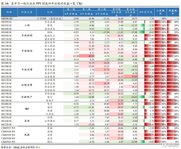 中游材料、中游制造和下游消费表现更优。行业大类来看,我们统计了PPI探底回升后31个申万行业的市场表现,其中中游材料、中游制造以及消费类行业取得超额收益概率更高,其中消费类行业取得超额收益概率达100%。而上游原材料、金融地产和TMT相关行业表现则较差。