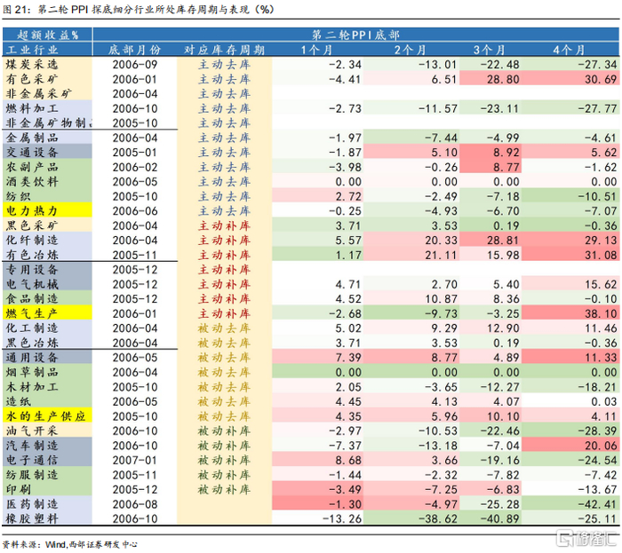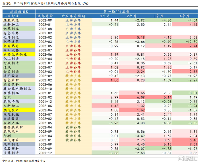 第一轮PPI见底,主动去库行业最多,主动补库行业表现最优。具体来看,第一轮PPI见底时,29支有数据的细分行业中有12支处于被动去库阶段,占比最多。其次分别为主动补库行业(7个)和主动去库行业(6个),被动补库行业(4个)数量最少。从表现来看,被动补库和主动补库的细分行业表现更优。PPI触底反弹后四个月分别较沪深300取得的3.1%和0.7%的超额收益。进一步分析,我们发现4支处于被动补库阶段的行业有三支为上游采矿类行业。而主动补库和被动去库行业主要处于中下游。本轮中下游行业库存周期轮动领先于上游行业。
