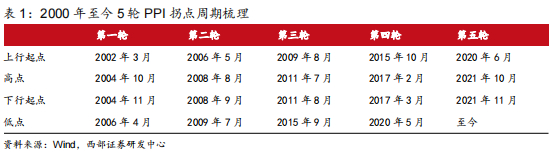 2000年以来,PPI经历过5轮比较明显的底部反转周期。根据PPI同比数据,底部月份分别对应2002年2月,2006年4月,2009年7月,2015年9月以及2020年5月。