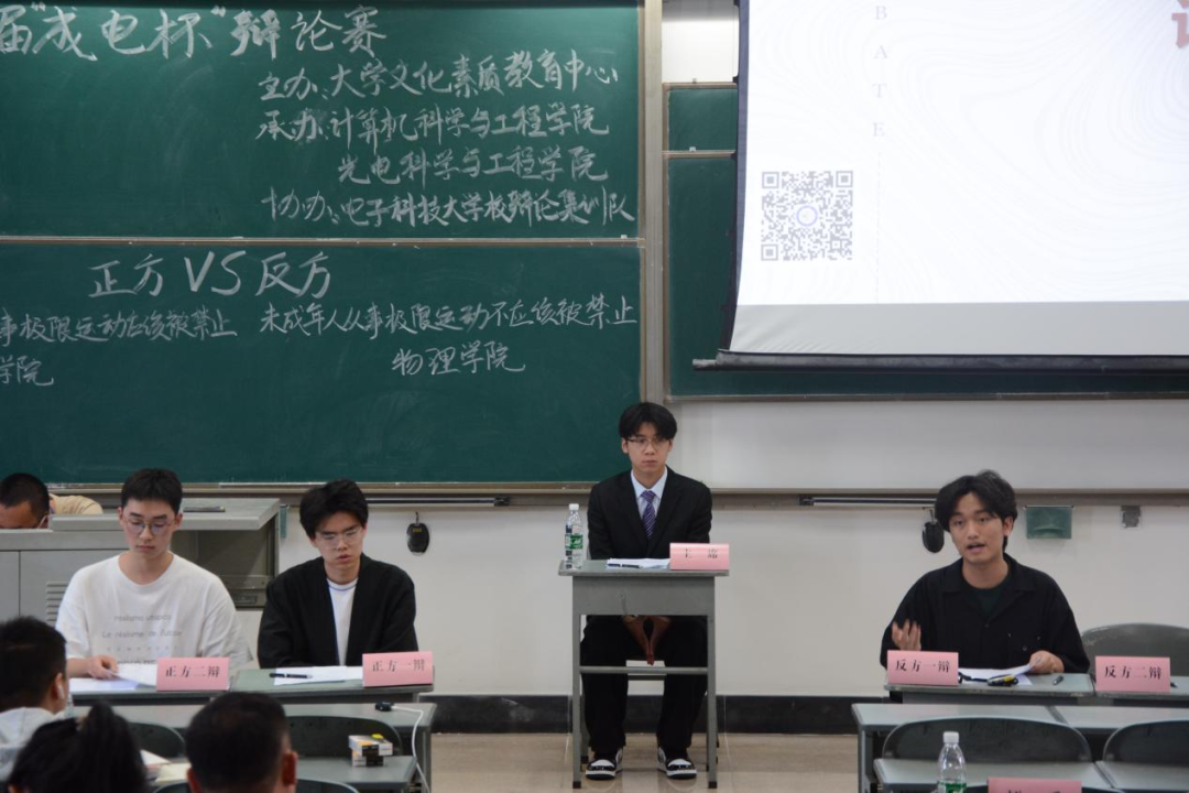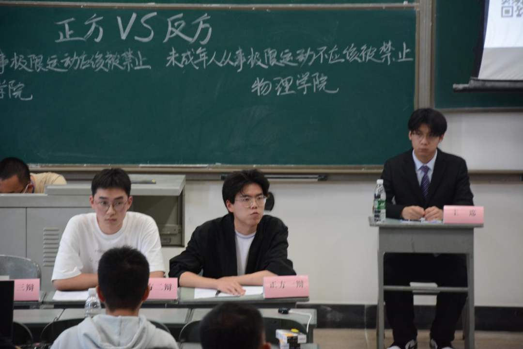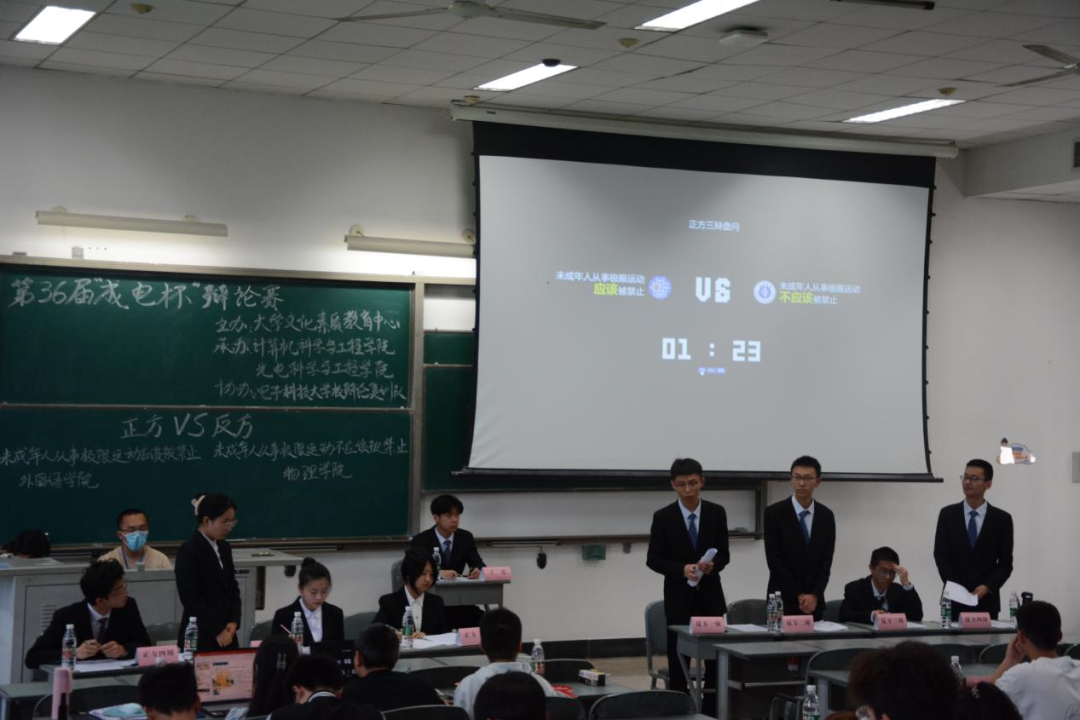 4月9日,来自外国语学院和物理学院、信息与通信工程学院和自动化学院的四支队伍在品学楼A308就“未成年人从事极限运动应不应该被禁止”这一辩题展开了激烈的辩论。