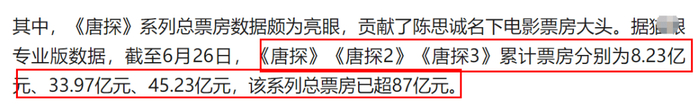 而《唐探》三部系列为他赚了超87亿的票房,其中《唐探1》票房8亿,《唐探2》票房33亿,《唐探3》票房高达45亿。