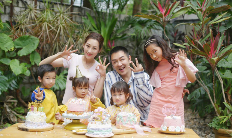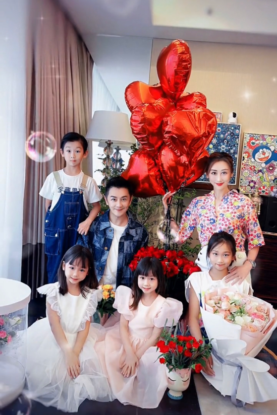 全家福中,蒋丽莎手拿多个红色心形气球,笑容十分甜美,身材与颜值都保持得非常好。三个女儿和一个儿子也全都出镜了,他们的长相都与爸爸陈浩民特别相似,一家人都是高颜值。