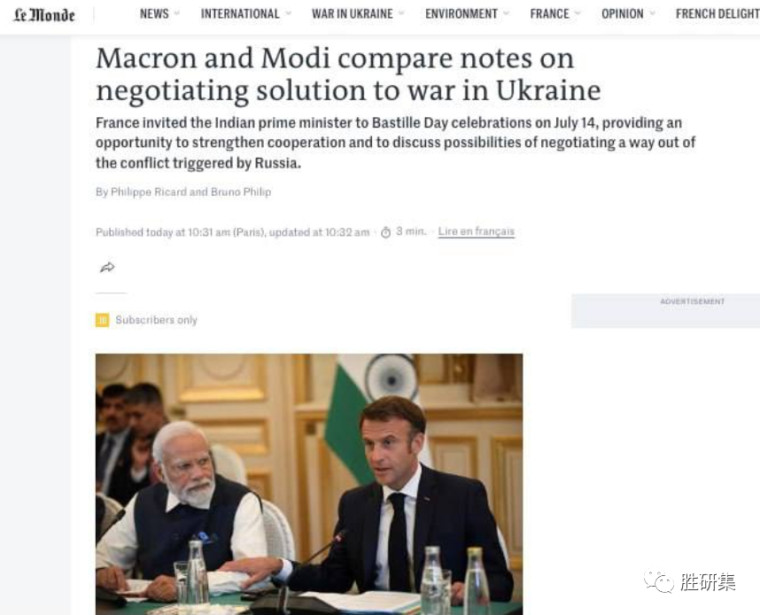 在印度总理7月13日至14日访问巴黎后,法国《世界报》报道称,莫迪命令他的下属与法国代表一起制定乌克兰和平计划,“以摆脱目前的外交僵局”。